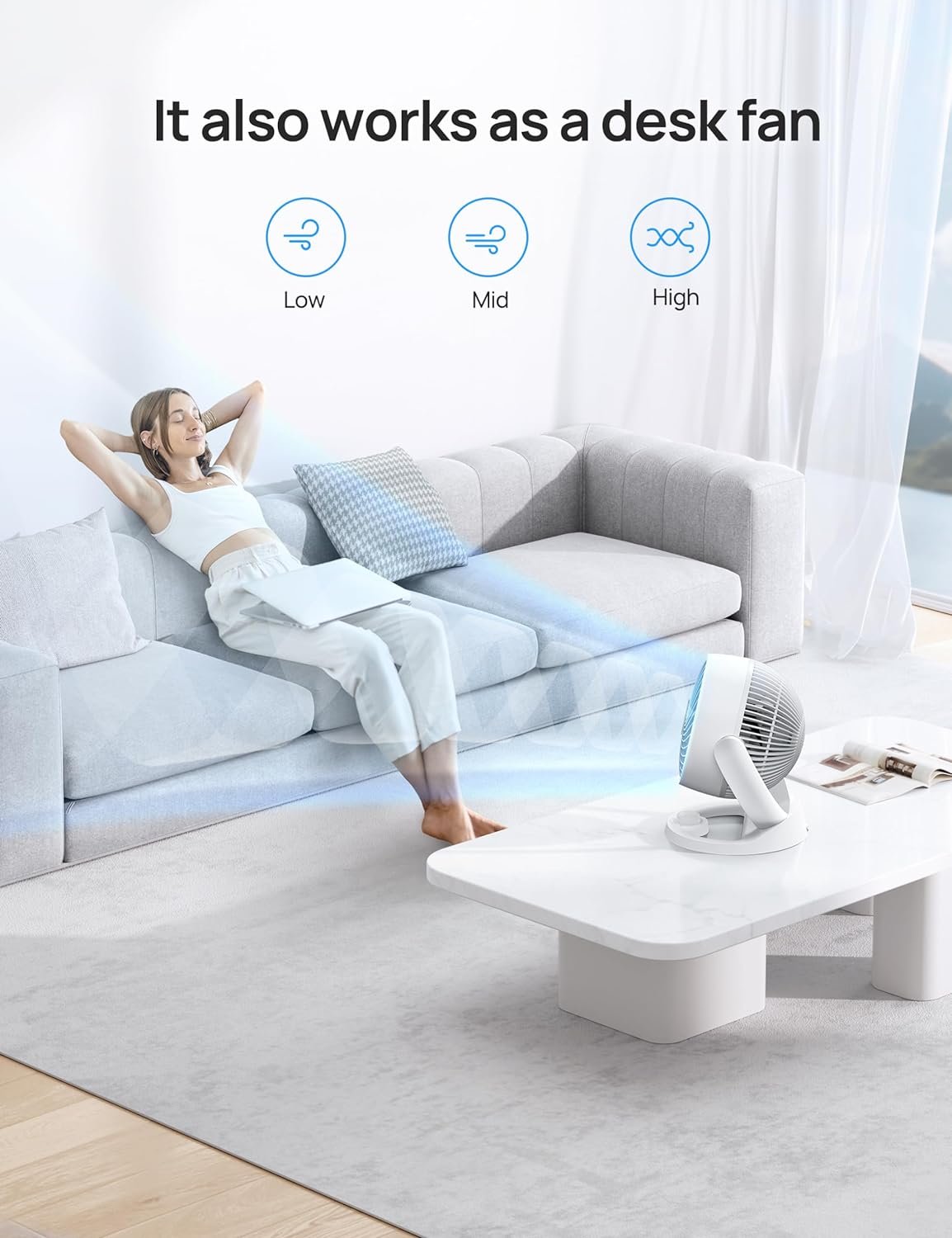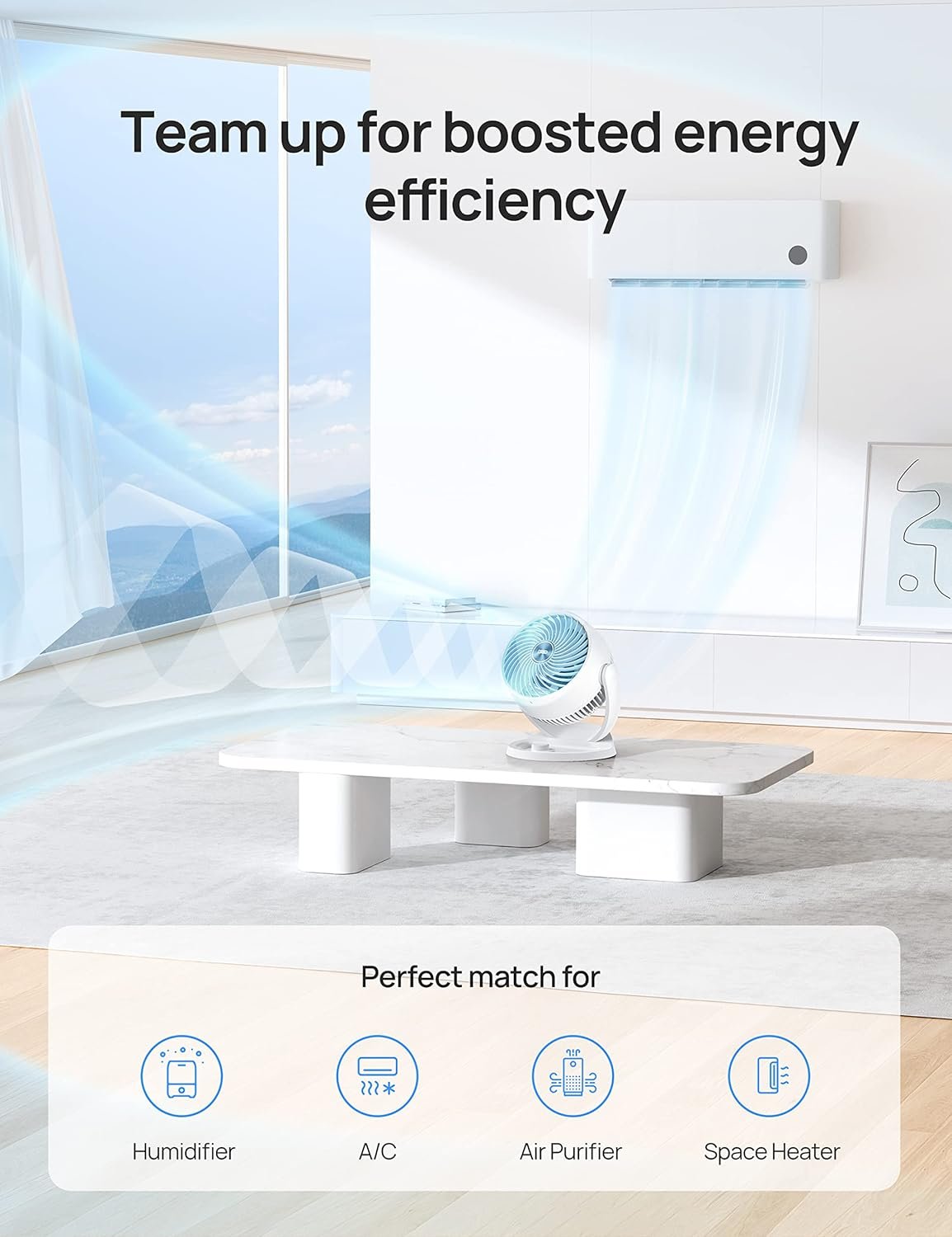 Save energy every season: Pair it with multiple appliances to increase efficiency and reduce your energy bills. Air circulators increase the effect of air conditioners, space heaters, humidifiers, and purifiers by moving the air faster around the whole room.