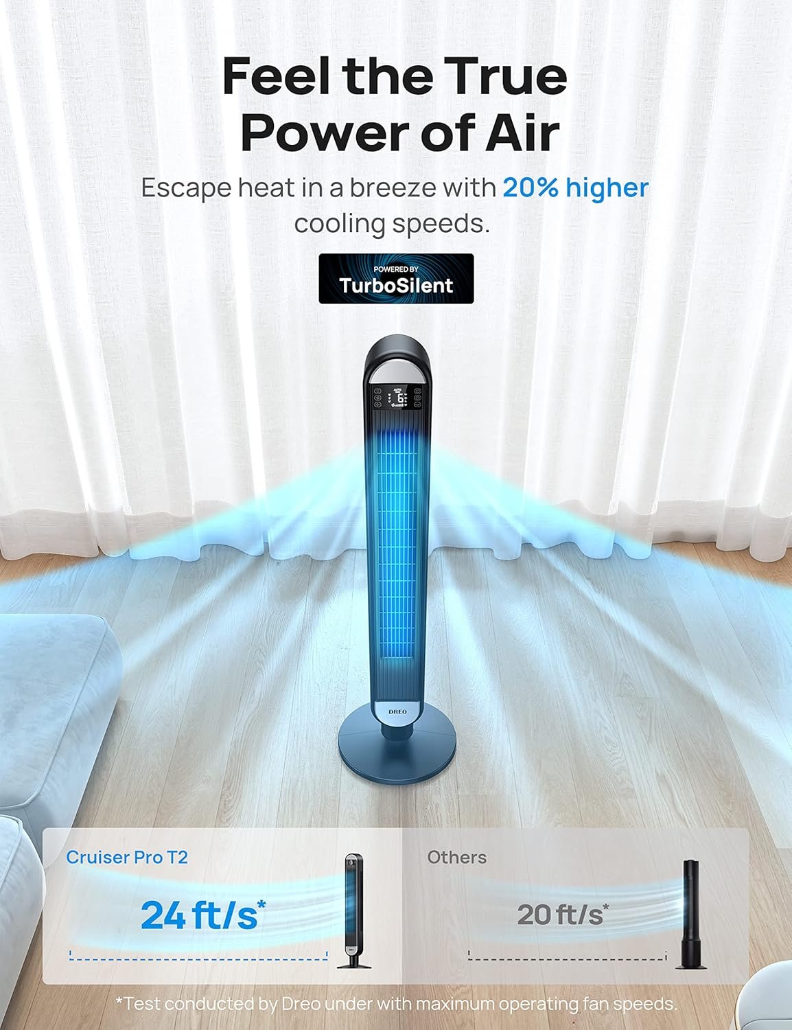 Product 2: 24ft/s Velocity: This oscillating tower fan effectively distributes ample air circulation to bring airflow to your room faster thanks to its wide 90° angle oscillation. Offers a continuous, refreshing breeze that keeps everyone in the room comfortable on hot days