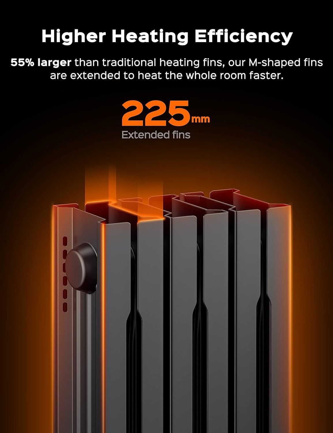 Product 1: Feel Heat Faster: The spindle-shaped openings, 225 mm larger than others enlarged fins and Dual U-shaped heating tubes make the Dreo oil radiator heater so effective in distributing heat that the heat can be doubled and released quickly, evenly and efficiently to a large area or the entire room.