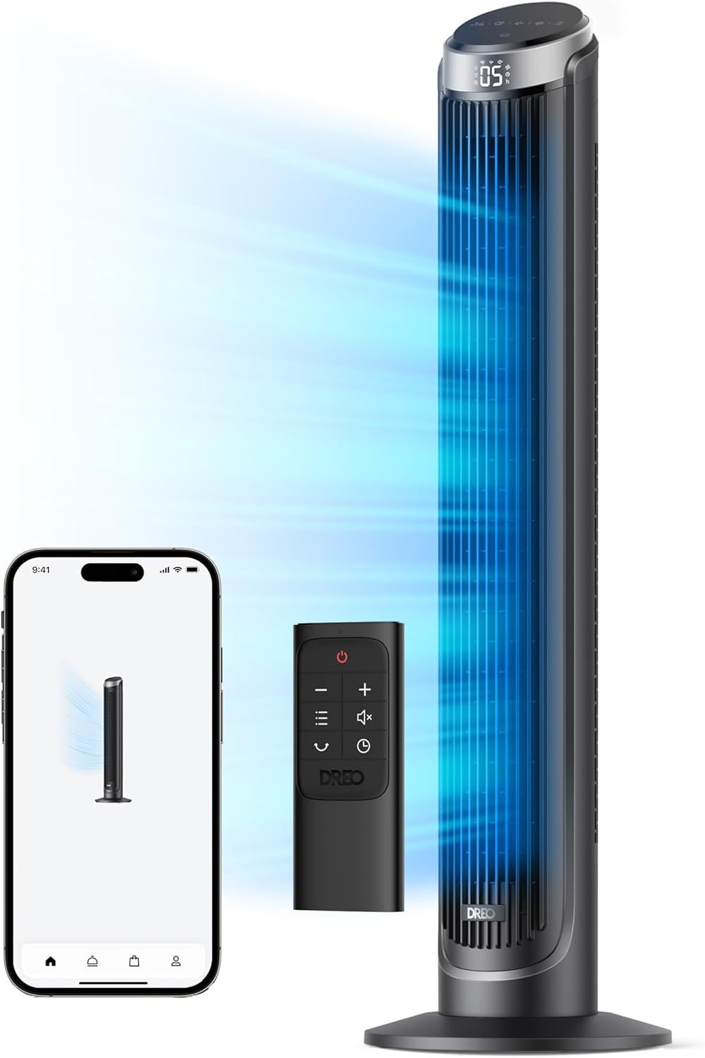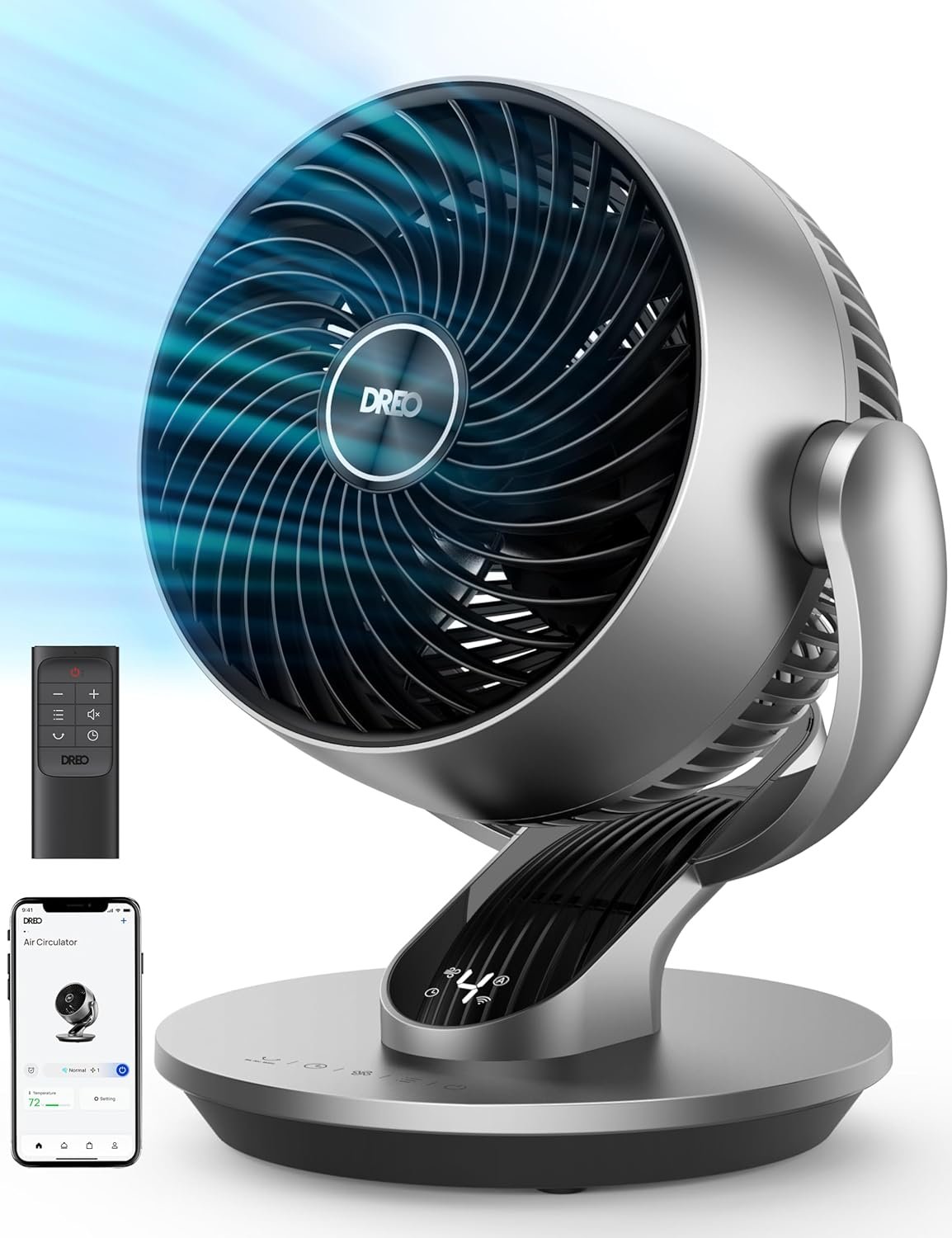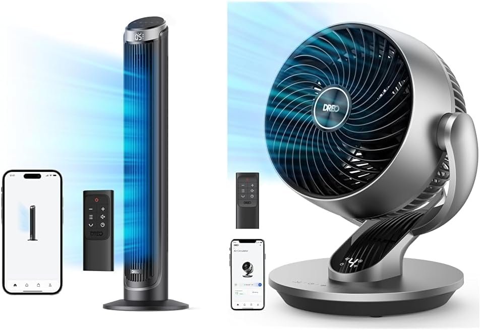 Upgrade your home or office airflow with this smart fan bundle from Dreo. It includes the Dreo Smart Tower Fan and the Dreo Smart Air Circulator Fan to deliver powerful, wide-range air circulation. The tower fan uses a 90° oscillation system to distribute air evenly around rooms up to 26ft/s. Its bladeless design is safe for kids and pets. Control speeds, modes, oscillation, and 8-hour auto-shutoff timer from anywhere with the Dreo app or voice assistants. At only 28dB, it won’t disturb sleep. The compact 13” air circulator fan provides 70ft air circulation, covering every corner of rooms. Its 120° vertical and 90° horizontal oscillation combats stale air. Like the tower fan, it connects to the Dreo app for customized control. Both fans combine with AC units to enhance efficiency. With brushless motors, these quiet fans run smoothly and reliably. The bundle lets you tackle stale air in bedrooms, living rooms, and offices with smart circulation for whole-home comfort.