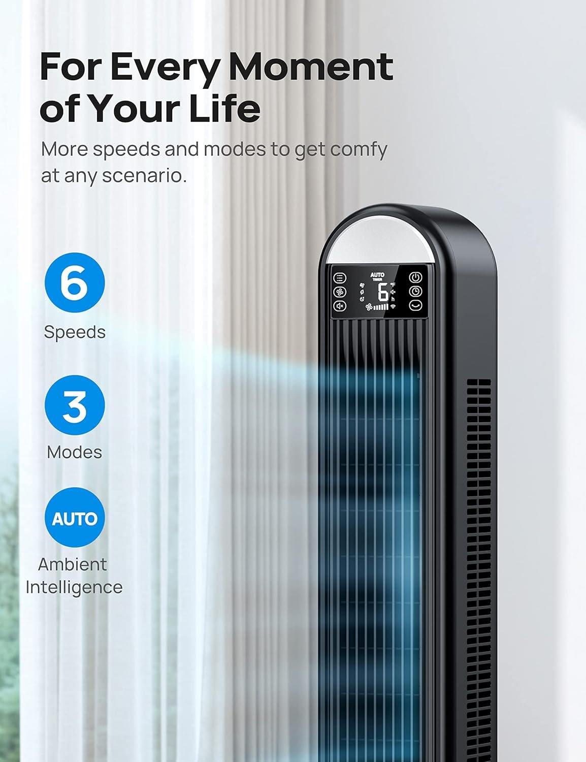 Reclaim Your Sleep: Engineered for maximum comfort, when preparing for bedtime, the tower fan’s enhanced sleep mode automatically finds the perfect balance between cooling and white noise while turning off the display brightness