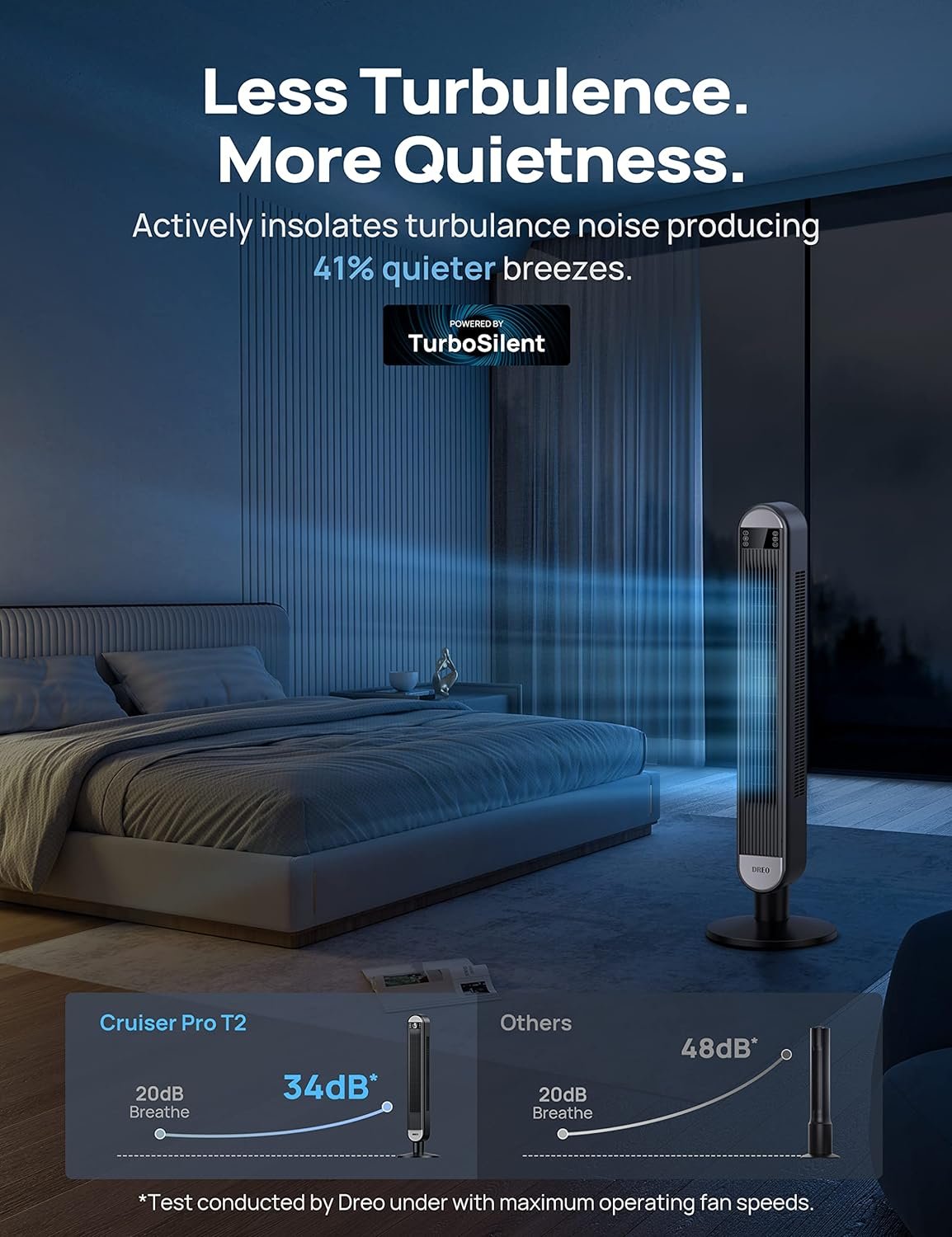 Quiet Without Compromise: Get the best of both worlds, the acoustic isolation design of this oscillating fan ensures noise reduction to a minimum of 34dB, while delivering a refreshing air breeze either at night or while you are focused working