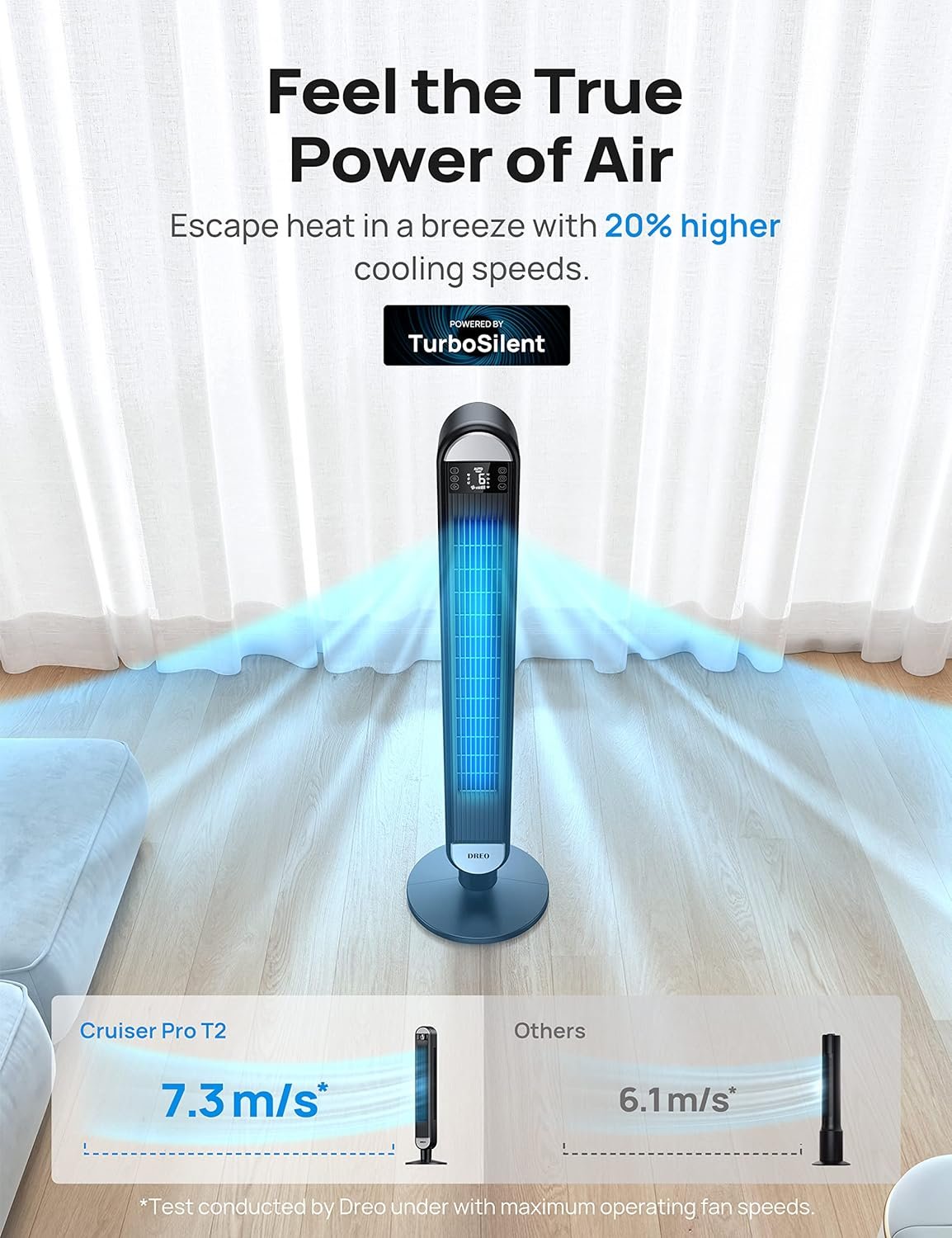 Massive Cooling Power: Dominate heat even at the most extreme conditions. The large 42-inch oscillating fan comes with a powerful motor and an airflow design that delivers faster cooling speeds with a massive 1236 CFM. Get cooling airflow even in the largest rooms and forget the sweltering summers with Dreo