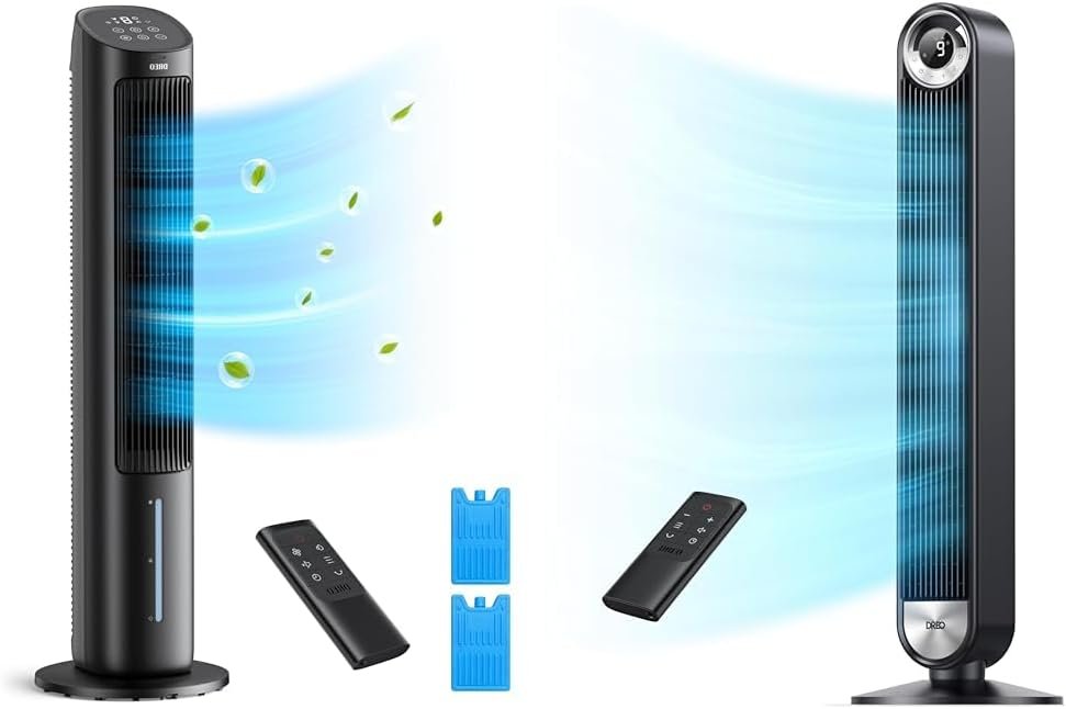Stay cool this summer with this bundle of two powerful and quiet Dreo tower fans. The first fan is a 40-inch evaporative air cooler that blows cold air up to 21.65 ft/s to cover large spaces. Its crossflow impeller wheel design produces quiet cooling for undisturbed sleep. Easy to maintain with a removable water tank, cooling pad, and grille. The second fan is an upgraded model with 9 speeds and 4 modes accessed through the control panel and display. It features fast 26 ft/s winds, quiet 25dB operation, and sensors that automatically adjust wind speeds. Both fans have oscillation to distribute air. The first fan’s wet cooling pad absorbs heat to provide cooler, more humidified air, while the second fan focuses on power and personalized comfort. Together they deliver strong airflow and versatile cooling options for bedrooms and other living spaces.