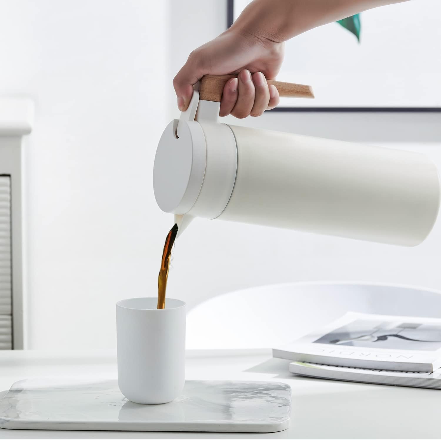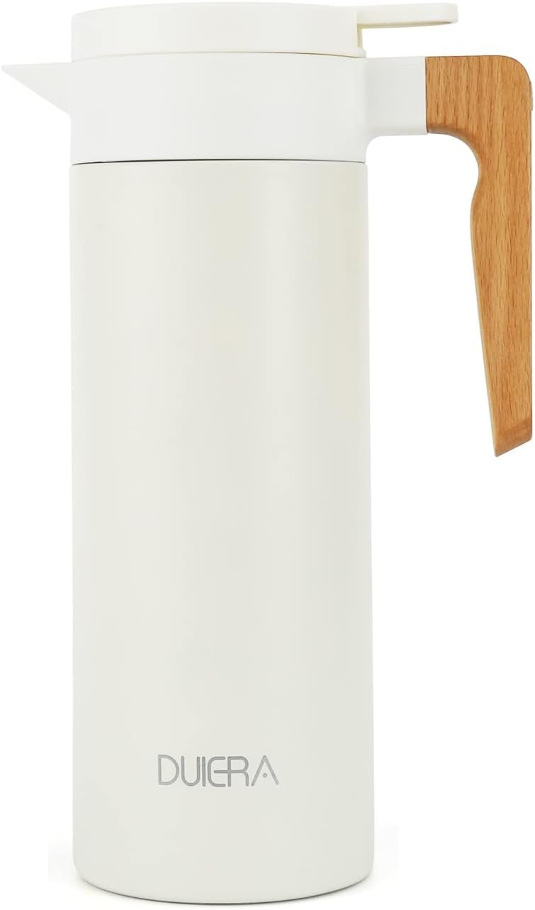Spill-Free Spout-The carafe for hot liquids with leak-proof lid is designed with a new insulated and air-tight structure, the coffee carafe larger size and dual silicon rings and always locks in the correct place. Ultimate comfort in handling through the press of a button, even with a slight tilt, our thermal coffee carafe will not leak one single drip
