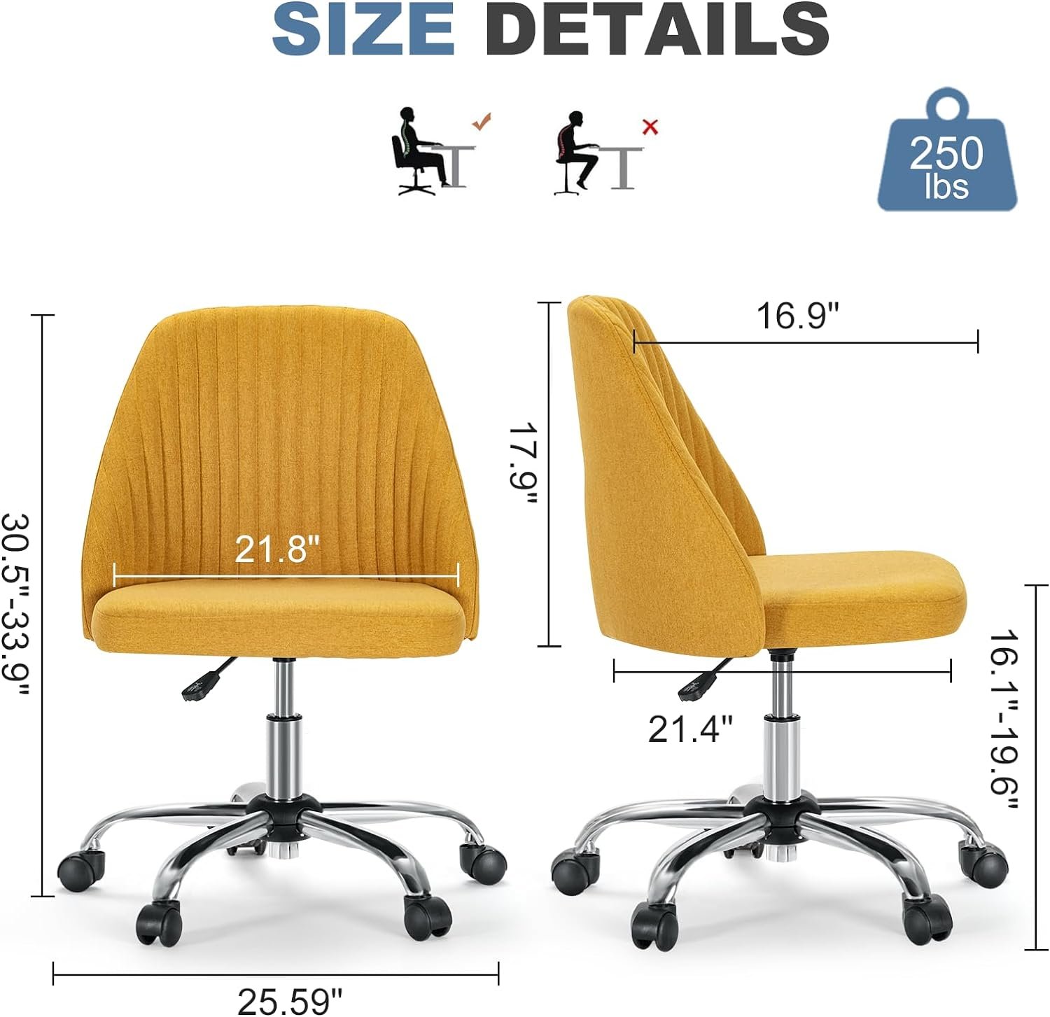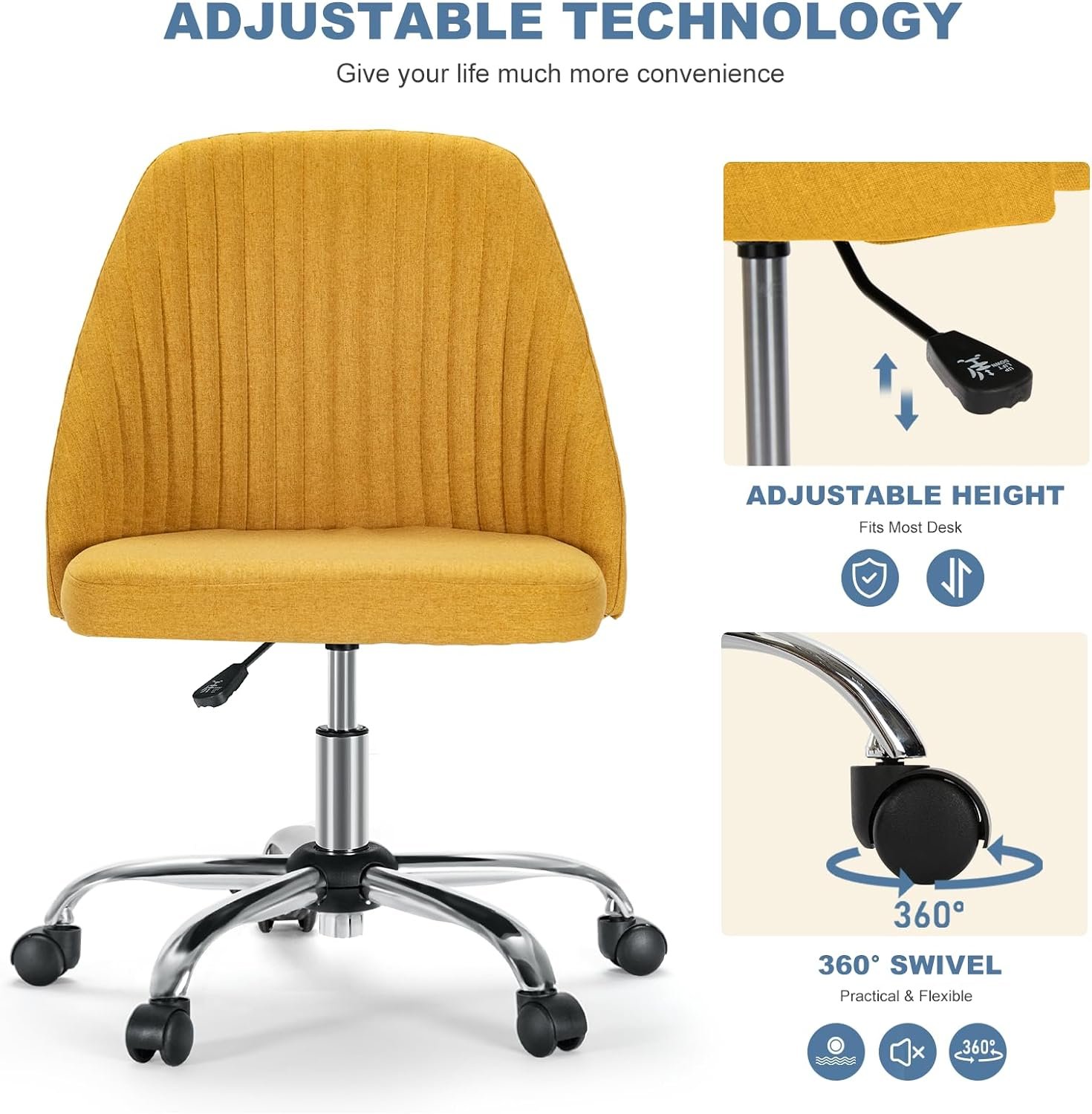 【Adjustable Function】Adjustable height function with armless design makes this office chair with wheels more flexible and free. Whether it is a lower vanity table or a higher desk, it can be perfectly matched with this height adjustable chair to improve work efficiency. Adjustable range is 14.57″- 18.51″.