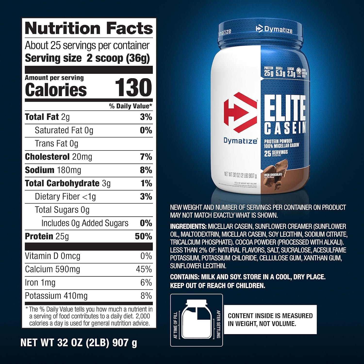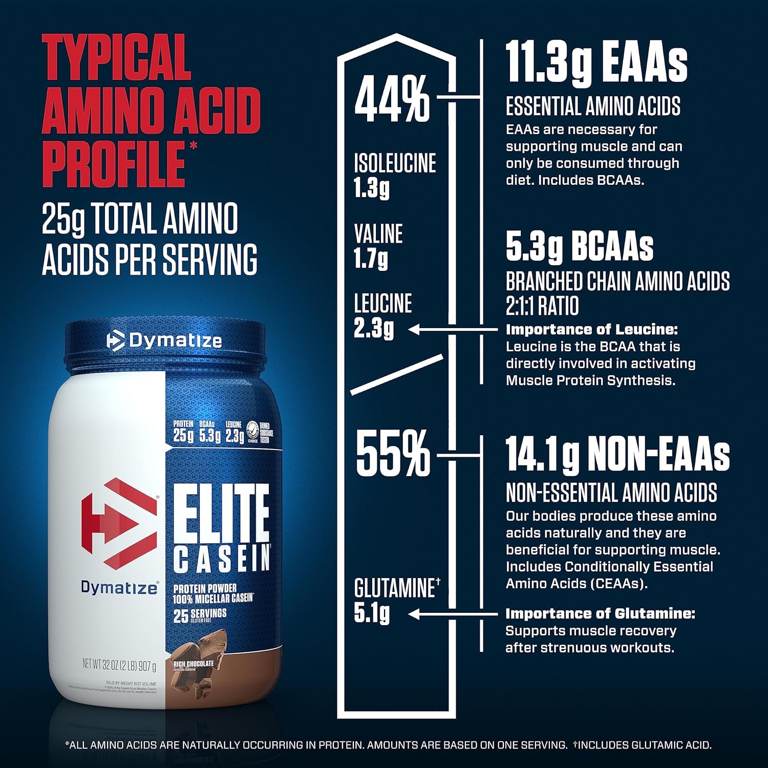 Dymatize Elite Casein Protein Powder, Slow Absorbing with Muscle Building Amino Acids, 100% Micellar Casein, 25g Protein, 5.4g BCAAs & 2.3g Leucine, Helps Overnight Recovery, Rich Chocolate, 2 Pound