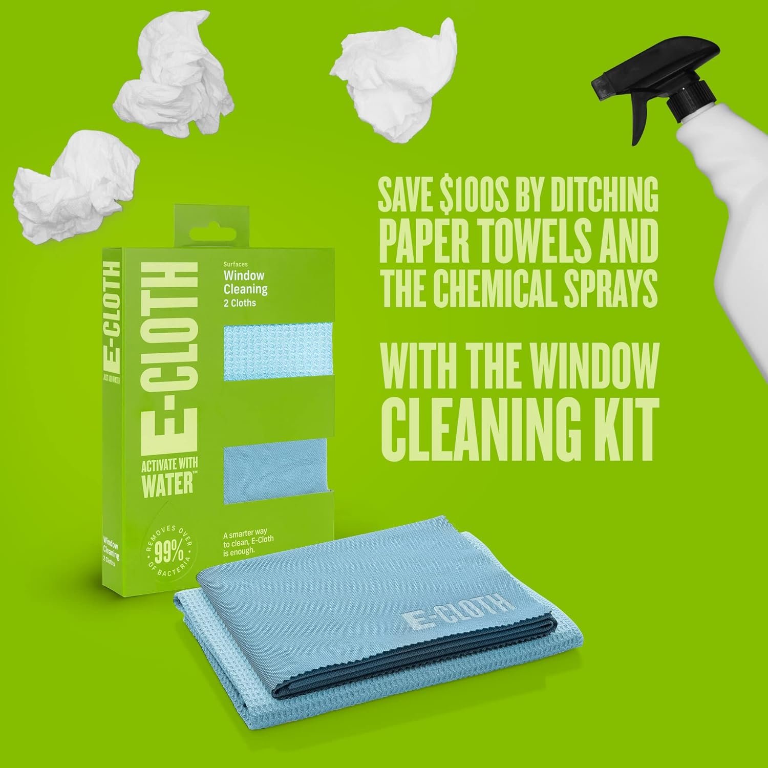 E-Cloth Glass Cleaner, Window Cleaning Kit, Microfiber Cleaning Cloth, Best for Cleaning Indoor and Outdoor Glass Windows and Doors, Car Windshields, Washable and Reusable, 100 Wash Promise, Blue