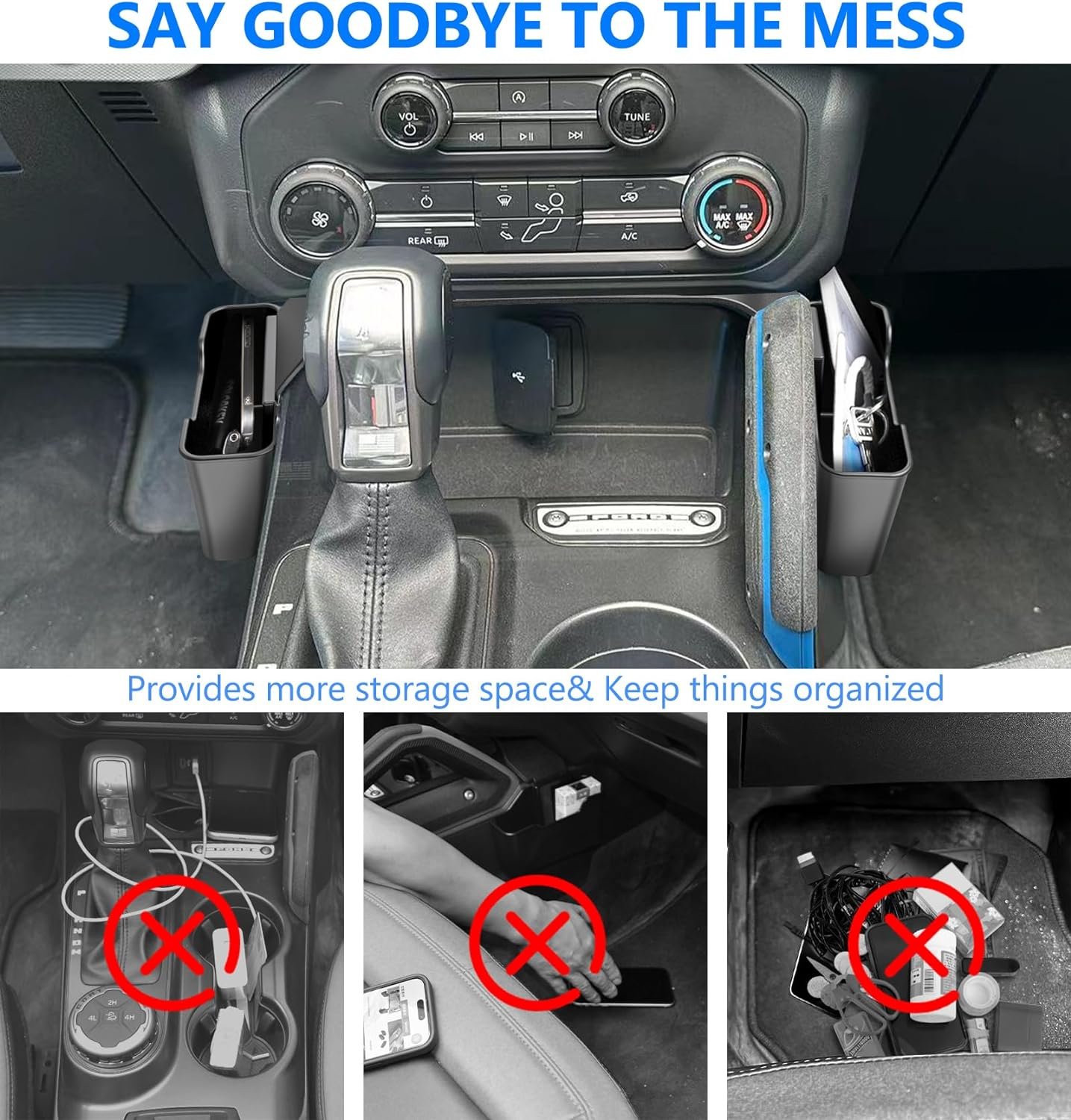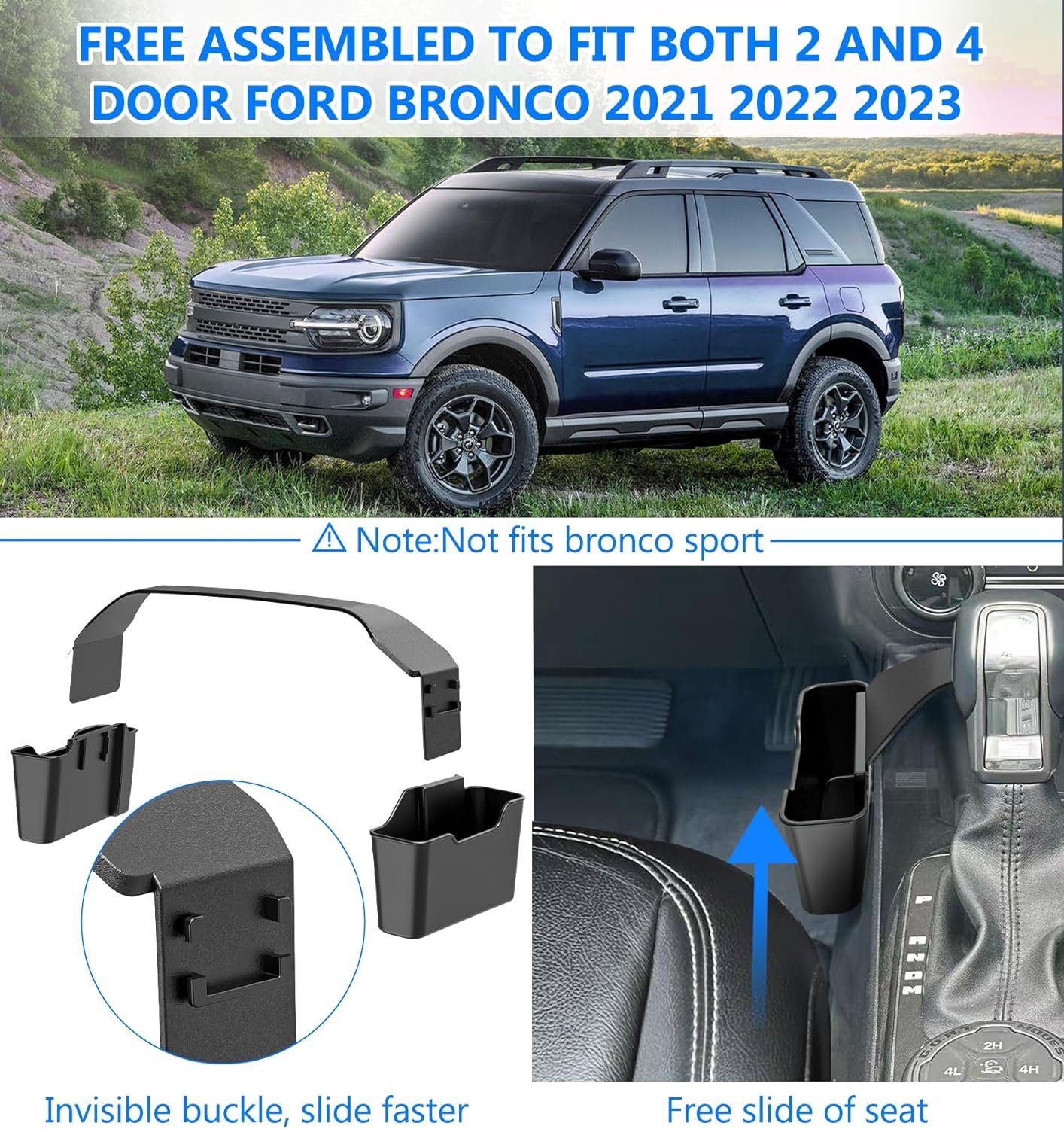 Easy to Install for Both 2/4 Door: No drilling, no tools required, tape attached, easy to install. This bronco center console inserts tray design with assembly, and is suitable for 2 and 4-door models, pulls out the bronco gear shift side box, and the front seat slides freely, easy access for rear passengers.And it also does not take up passenger legroom.