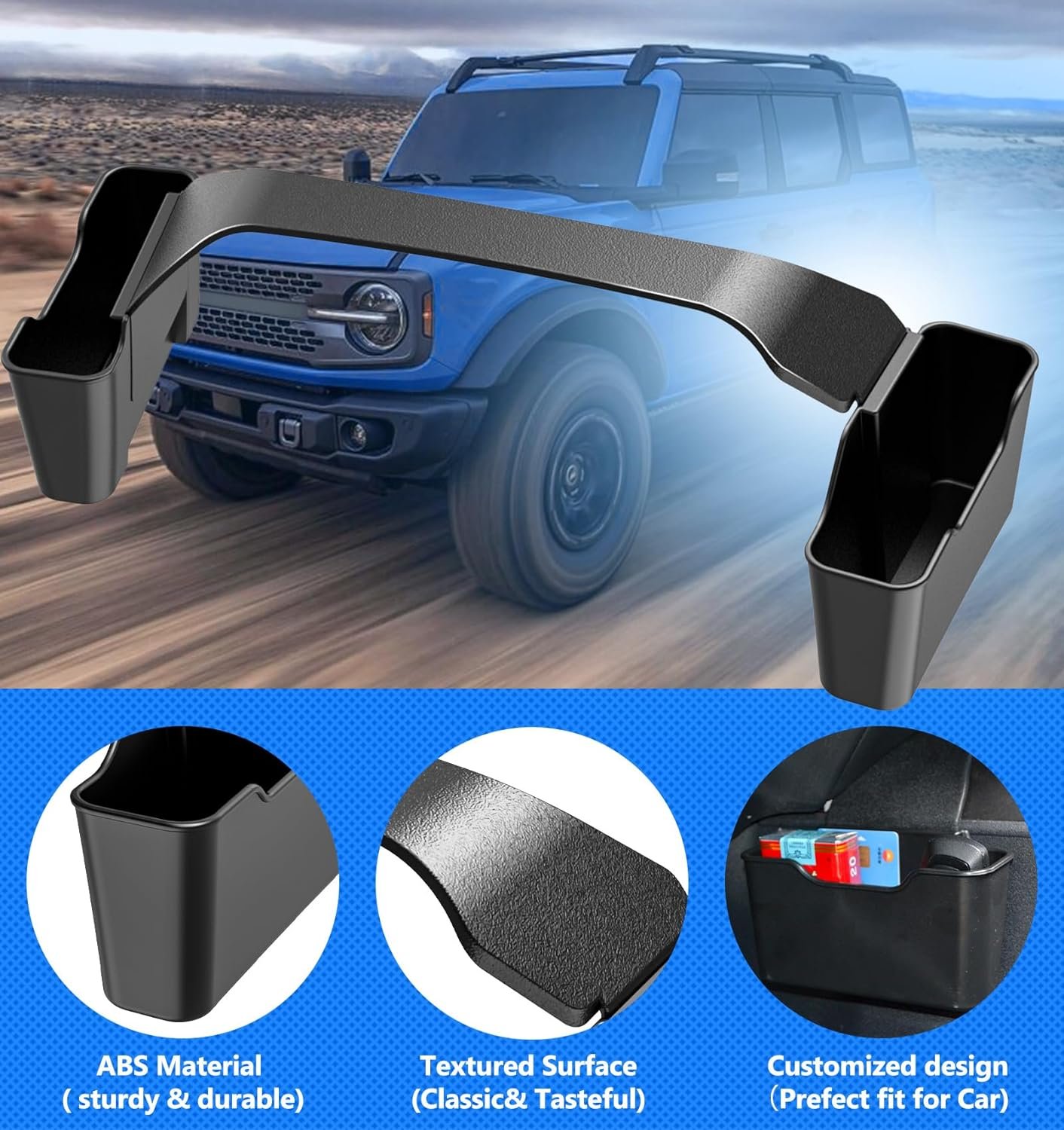 High-Quality Material: This 2023 ford bronco accessories is injection molded from high-quality ABS material, strong and durable; the beam is finished with a black texture process, which looks like an integral part of the original car. Furthermore, the tape attached to the back makes the Bronco storage box will not easy to loosen like others.
