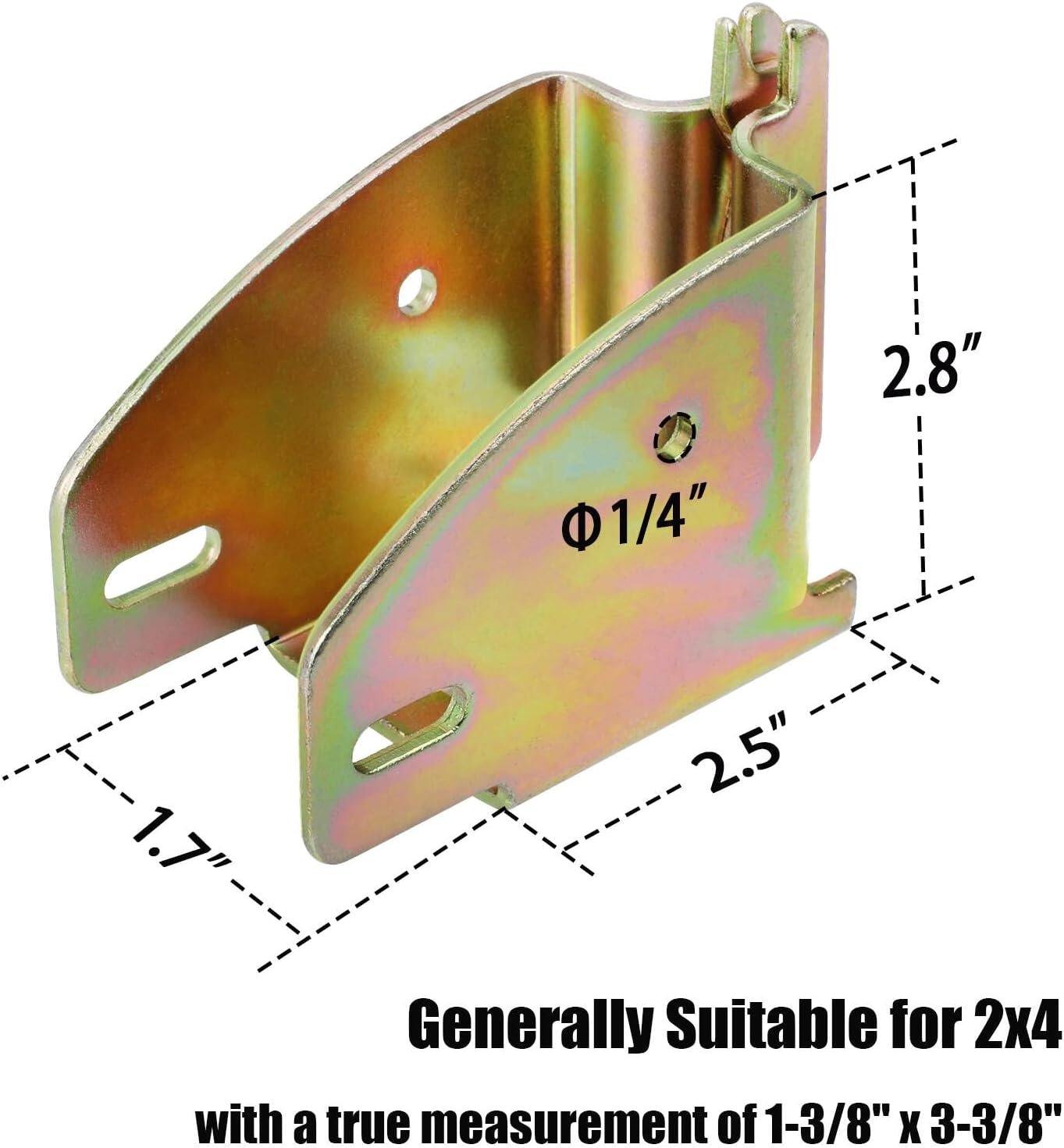 Height 3.4″ x Length 4.4″ x Inside Width 1.7″, 2 bolting holes diameter 1/4″.– These socket tie downs are generally suitable for use with standard 2x4s (with a true measurement of 1-3/8″ x 3-3/8″). The 4 bolting holes have diameters of 1/4″.