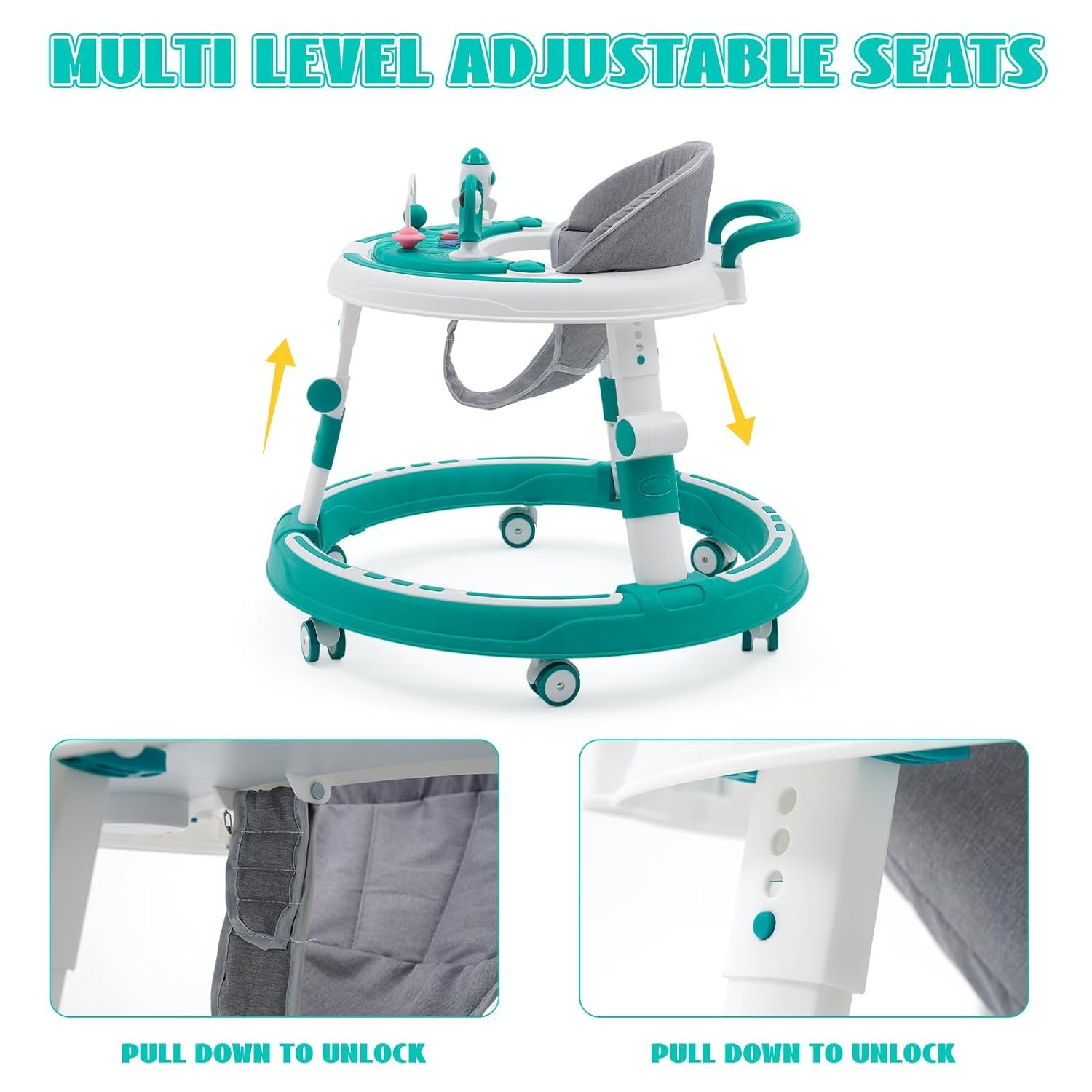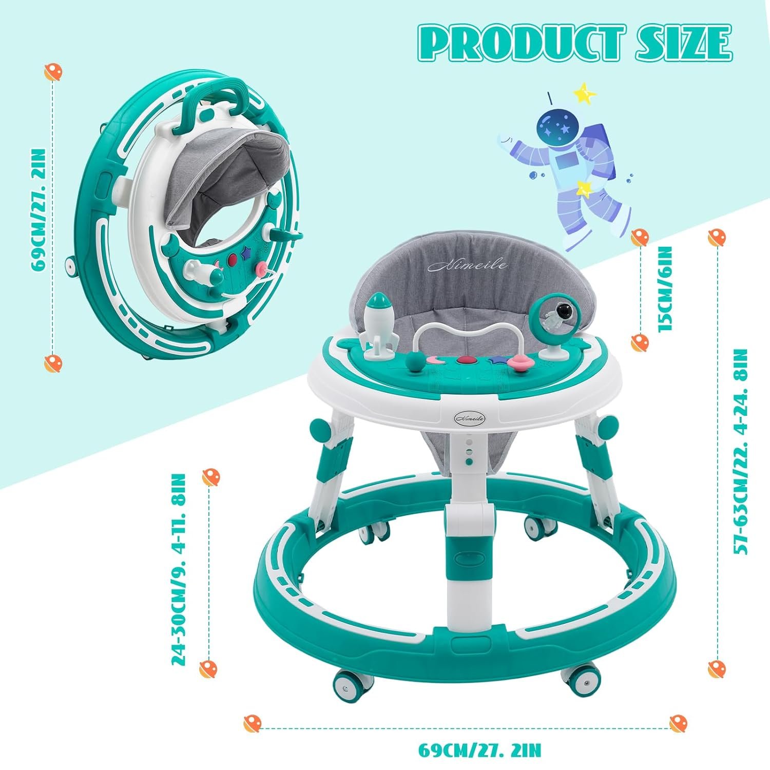 【8 level Adjustable Height】 This infant walker has 8 precise height adjustments (22.4 inches to 24.8 inches), providing 4-level height adjustment and 4-level seat cushion height adjustment. To adapt to different children and growth stages, scientifically designed seat cushions can effectively prevent O-shaped legs.