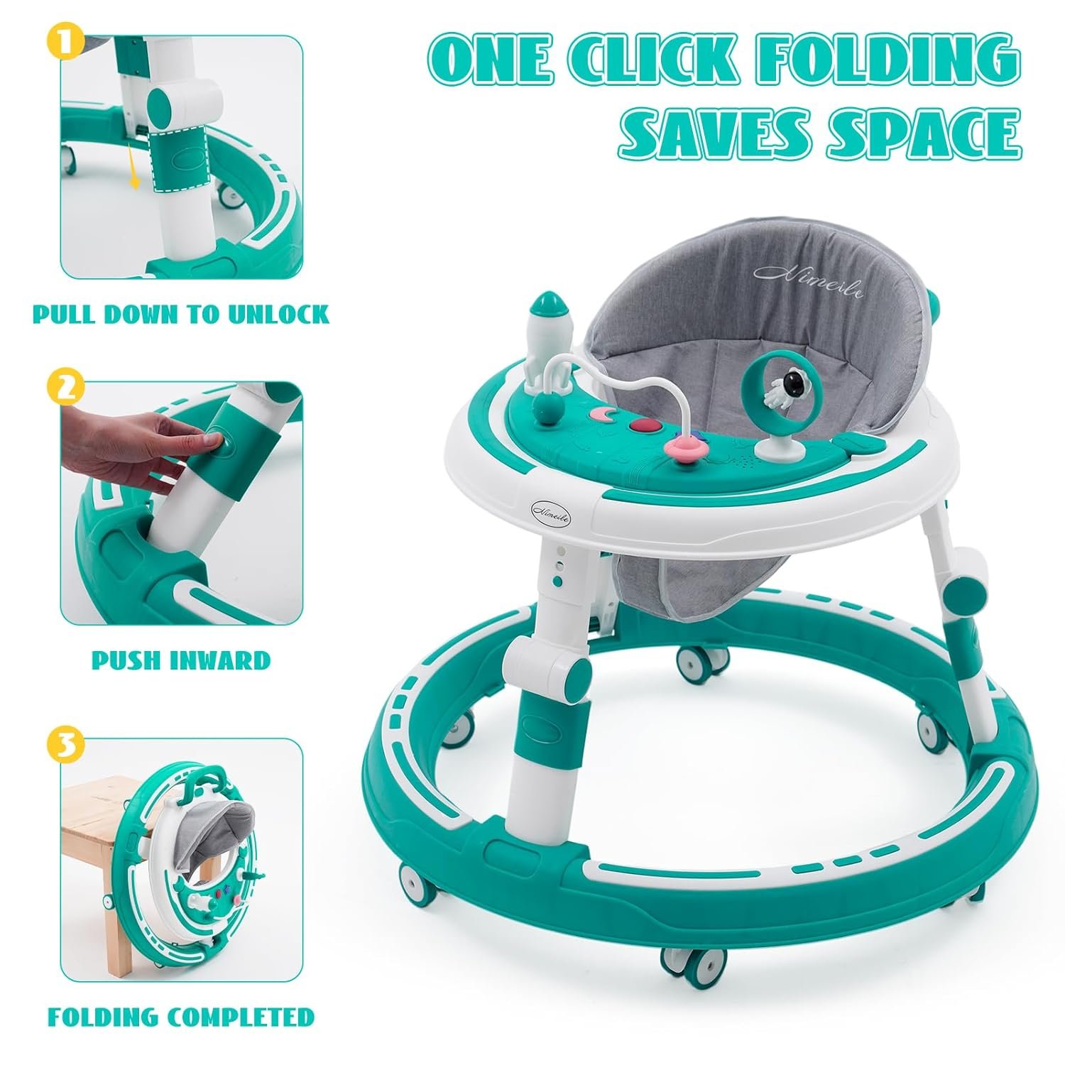 【Portable and Foldable】 This foldable baby walker pulled down to unlock and pushed inward to complete folding, making it easier to transport or store when not in use. It can be easily placed under a table or bed, with a small footprint and easy to store and carry
