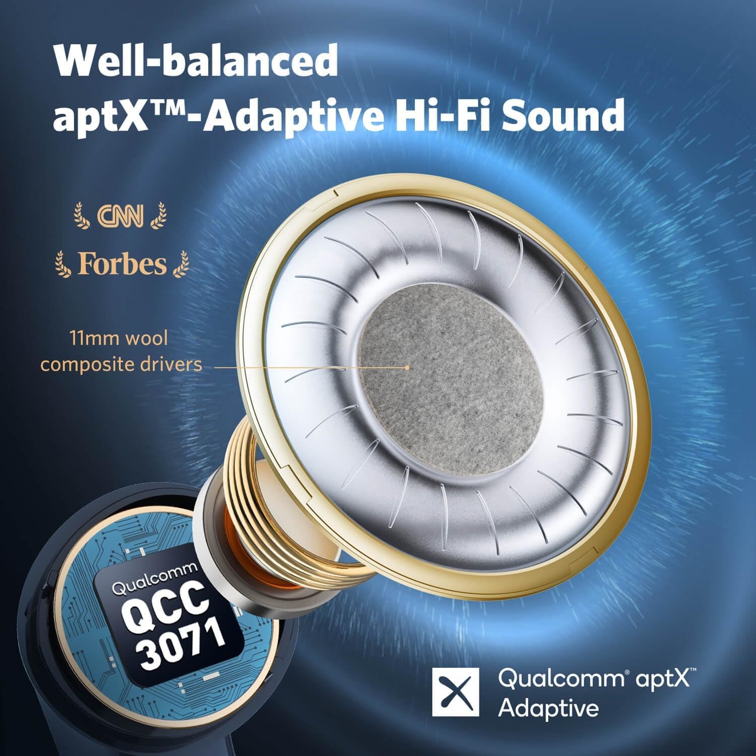 🎧[Latest Qualcomm QCC3071 SoC & aptX Adaptive Audio] Powered by the advanced QCC3071 chipset and Qualcomm aptX Adaptive Audio technology, the TWS earbuds deliver powerful sound and incredible range while minimizing distortion. The EarFun Air Pro 3 earbuds are driven by premium 11mm wool composite dynamic drivers that deliver deep, moving bass, clear mids, and crisp highs.