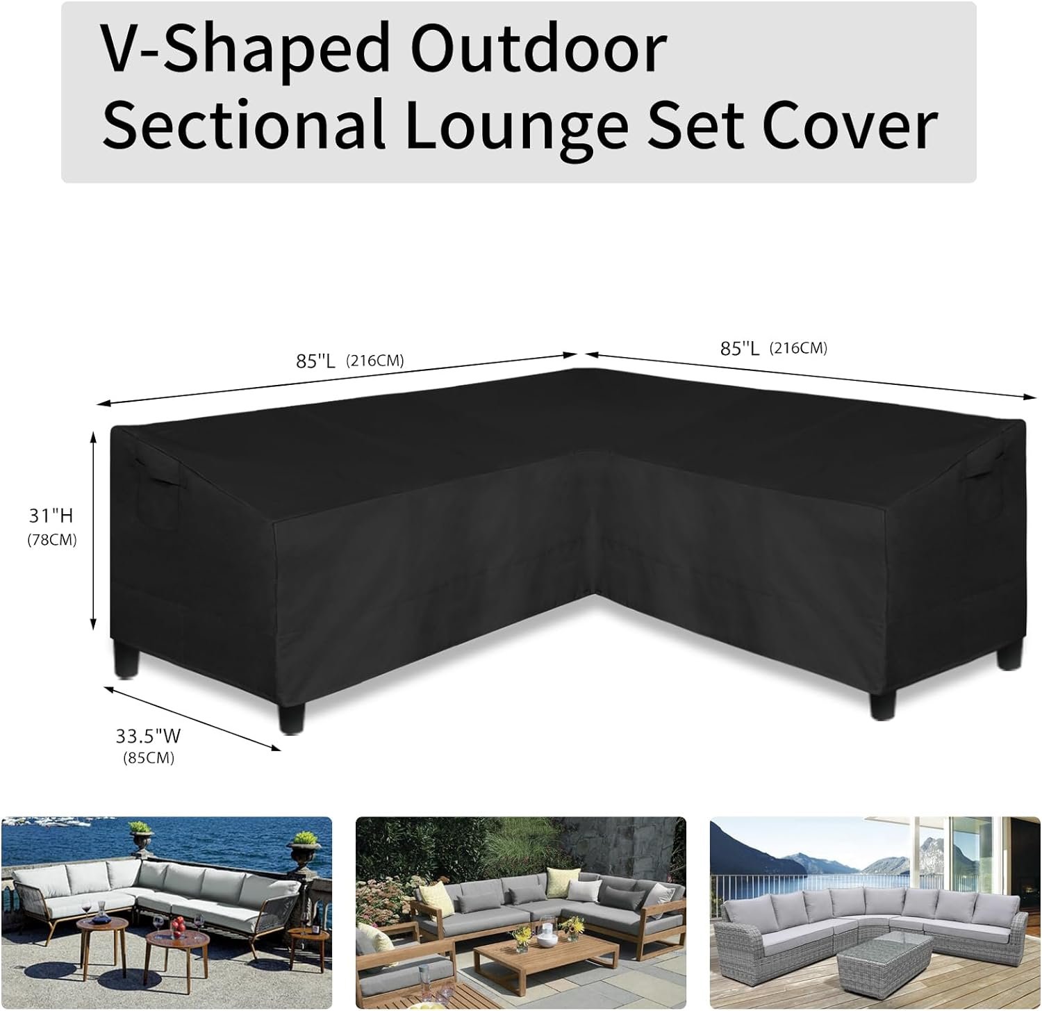 Outdoor Sectional Cover Size: The dimensions of the sofa cover is 85″L (on each side) x 33.5″D x 31″H, fit for most V-shaped sectional lounge sets. Please measure your sofa size before purchasing. It is suggested to choose the cover 1-2 inch larger than your sofa size.