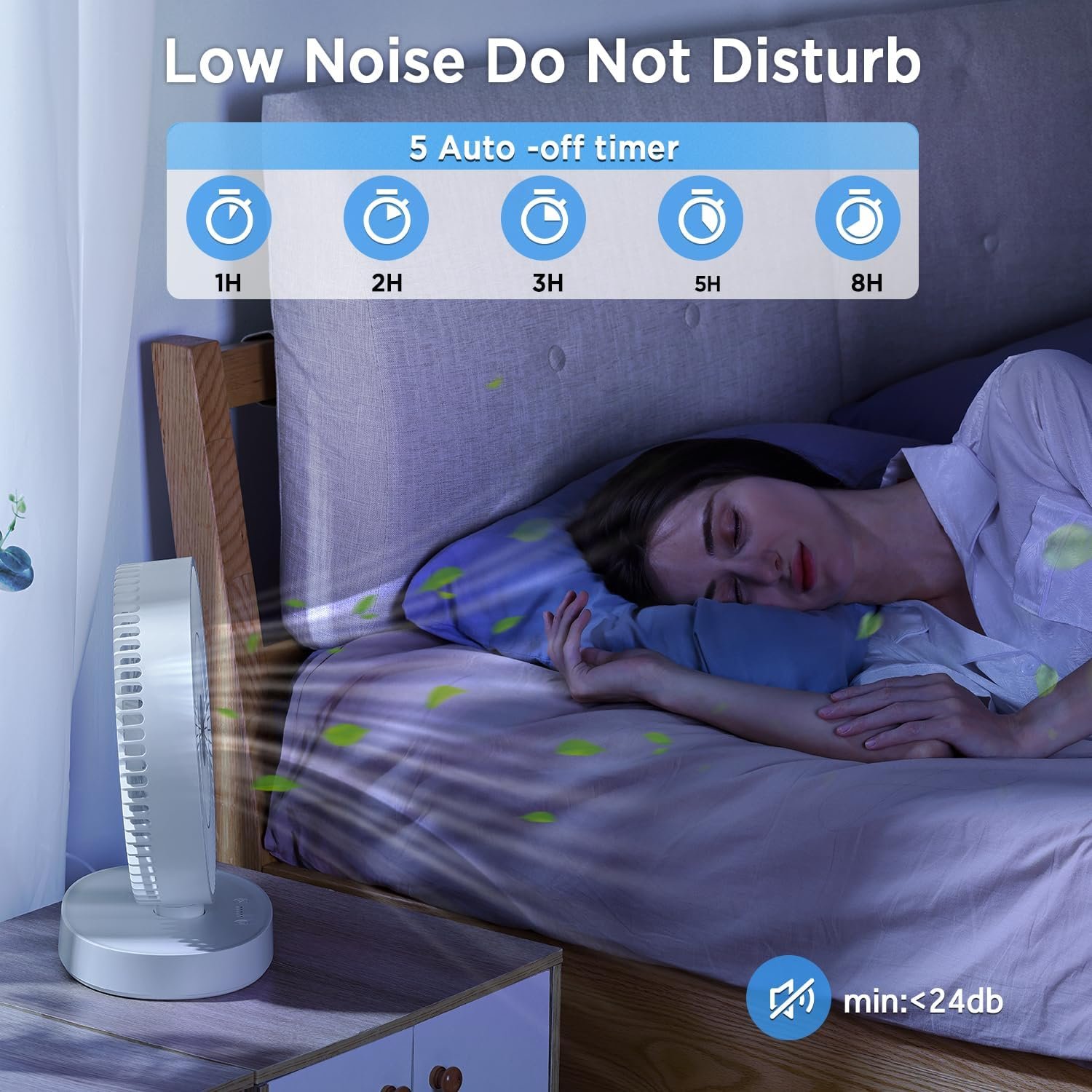 【5 Speed Regulation And Timing】 Our table fans has 5 adjustable speeds and timer function. The first gear: natural wind; the second gear: weak wind; the third gear: strong wind; the fourth gear: very strong wind; the fifth gear: soft breeze. The fan is provided with 1, 2, 3, 5, 8 -hour auto shut-off timer. After running for the set duration, the office fan will automatically get switched off.