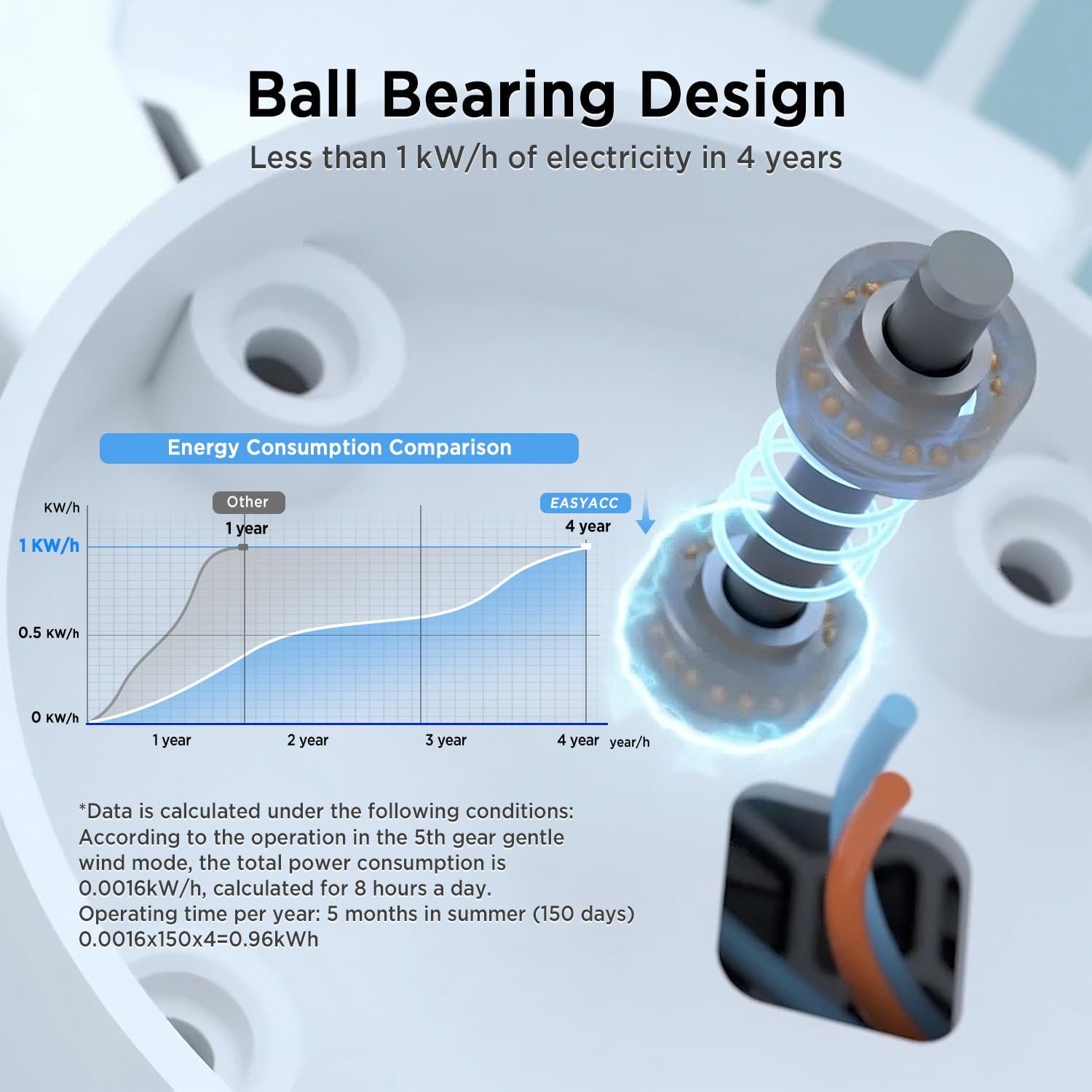 【Super Energy Saving Circulating Fan】 Our built-in motor adopts a ball bearing design. High efficiency, energy saving, durable, and the service life is more than 100,000 hours. According to the operation in the soft wind mode of the fifth gear, calculated for 8 hours a day, the total power consumption is 0.0016 kw/h, and the summer time is 5 months (150 days) 0.0016 kw/h*150*4=0.96 kw/h. passed Upgrade to our energy efficient fans and enjoy cool, fresh air while saving a lot of money.