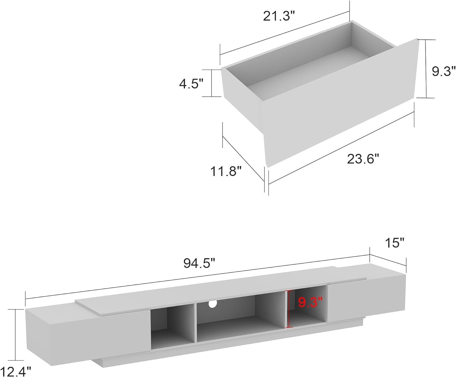 Specifications: Material: High-quality MDF & particle boards Color: Black or White Dimensions: 94.5” (W) x 12.4” (H) x 15” (D) Drawer Interior:21.3” (W) x 4.5” (H) x 11.8” (D) Maximum TV Size: Up to 100″ Assembly Required: Yes Package Includes: 1 x TV Stand & Assembly Instructions