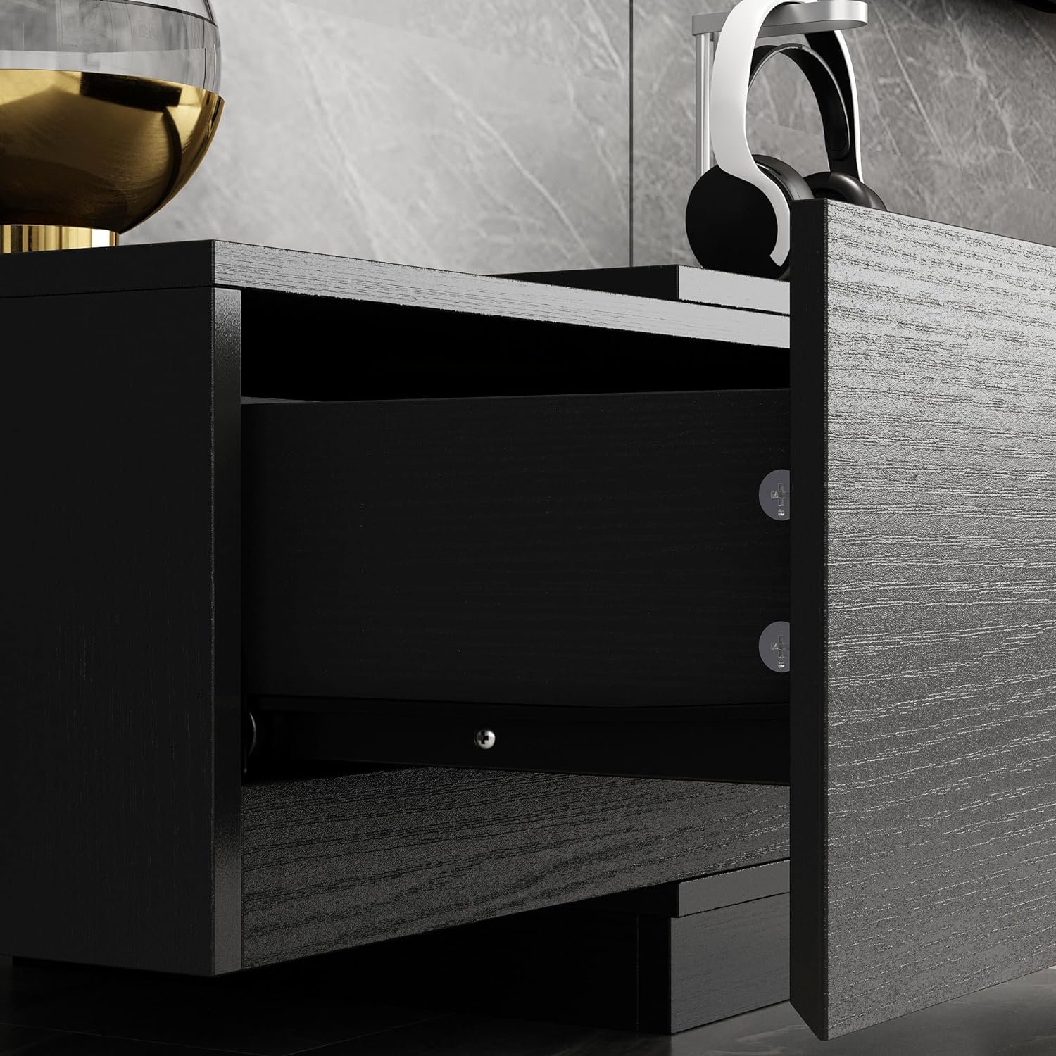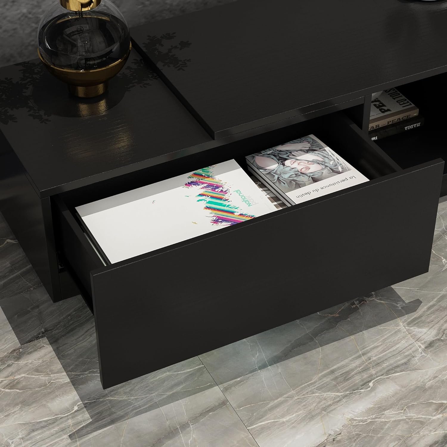 Crafted from high-quality MDF and particle boards, our entertainment center ensures stability and durability. Its freestanding design with a heightened base provides exceptional stability, while the sleek black finish adds both style and longevity to your space.