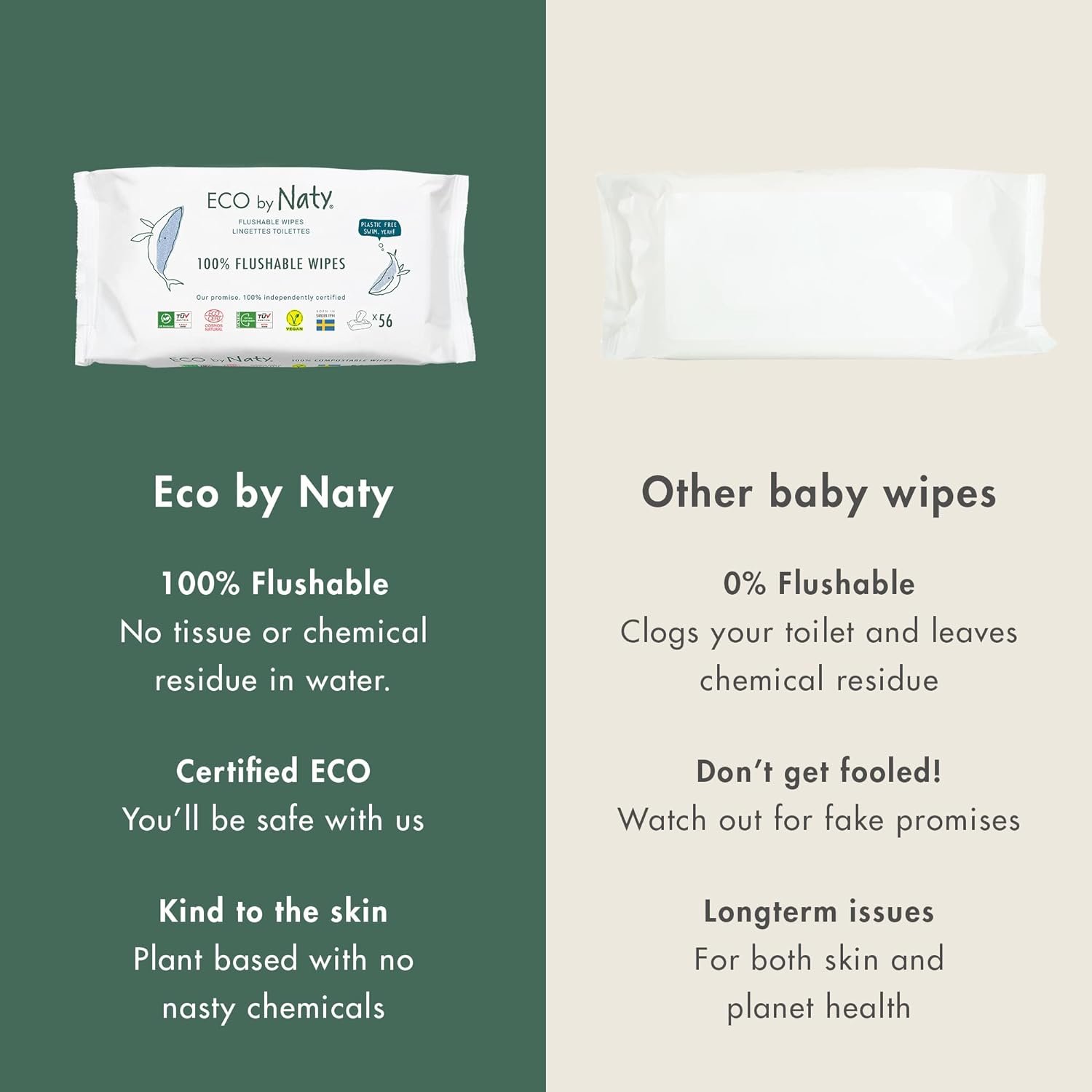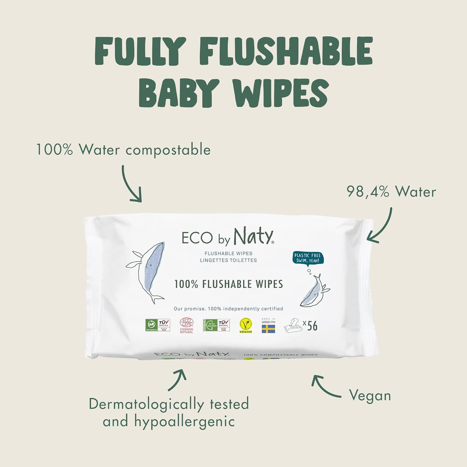 Eco Cert: Cosmos Organic. Cruelty free- Certified vegan free label. When we say we care about the planet, we mean the animals live here too. Thats why we never harm any living creatures when making products. Flushable wipes. Plastic here. Swim, yeah! Check out what’s inside. All our ingredients are natural origin of total amount Cosmos Natural certified by Ecocert Greenlife according to Cosmos Standard. Our promise. 100% independently cerified Find out how we select our awesome ingredients at Naty.com Packaging made of renewable materials TUV Austria: Ok compost – Home. 100% water compostable- certified TUV Austria. Our wipes are completely biodegradable in water. Eco cert. Cosmos natural. 0% plastic. No nasty chemicals- certified by Ecocert Cosmos. Naty wipes contain 99.51% plant based ingredients. 100% renewable materials. Our products are plant based which means they are completely free. Born in Sweden. Made in Turkey