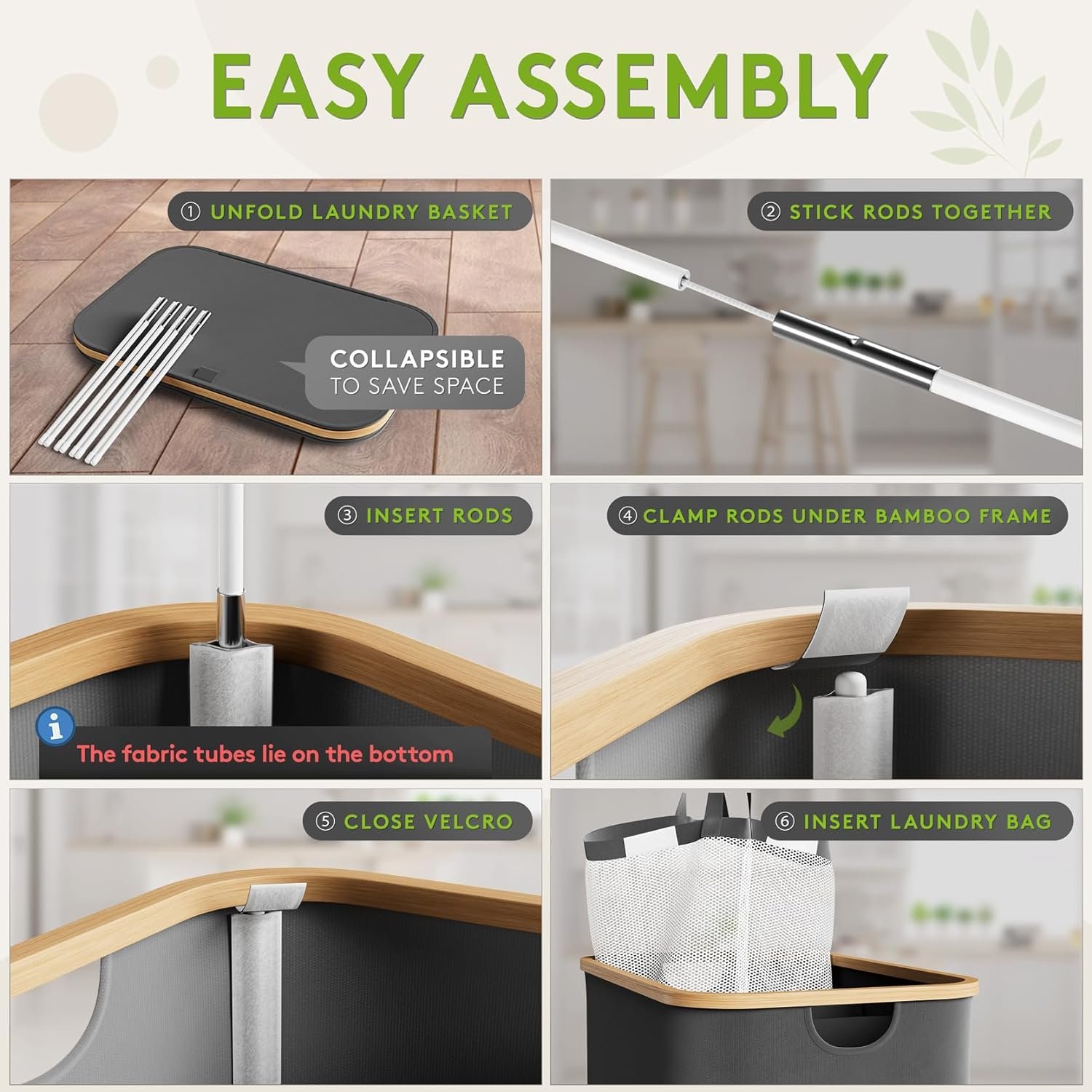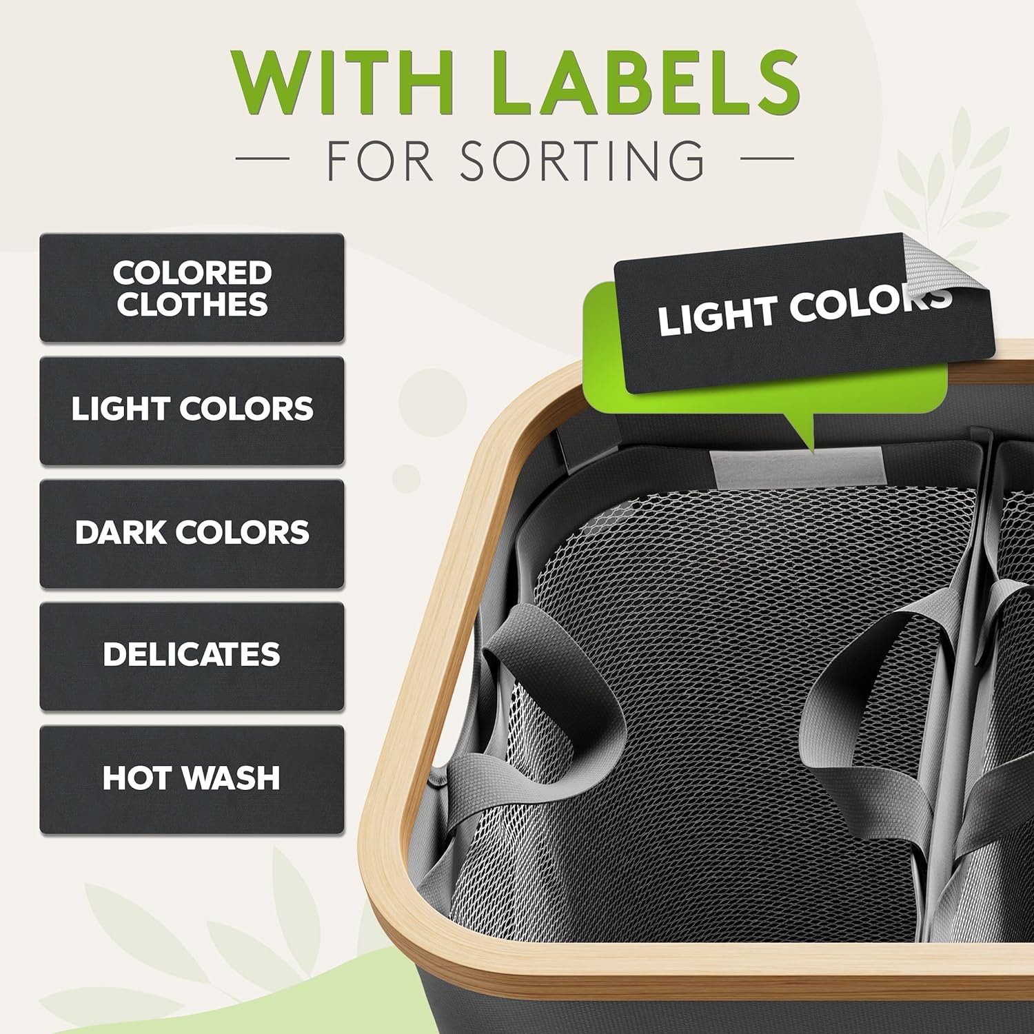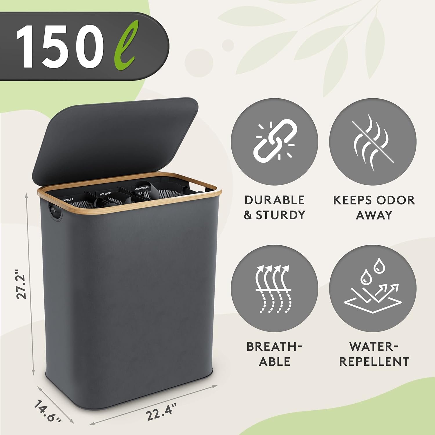 ✅ 𝟑 𝐒𝐄𝐂𝐓𝐈𝐎𝐍𝐒 & 𝐋𝐀𝐑𝐆𝐄 𝐂𝐀𝐏𝐀𝐂𝐈𝐓𝐘- Our spacious dirty clothes hamper with a 150L capacity and an elegant bamboo frame fits perfectly in any room. The foldable laundry basket measures 27.2 x 14.5 x 22.4 inches and comes with 3 compartments to make laundry day as easy as possible!