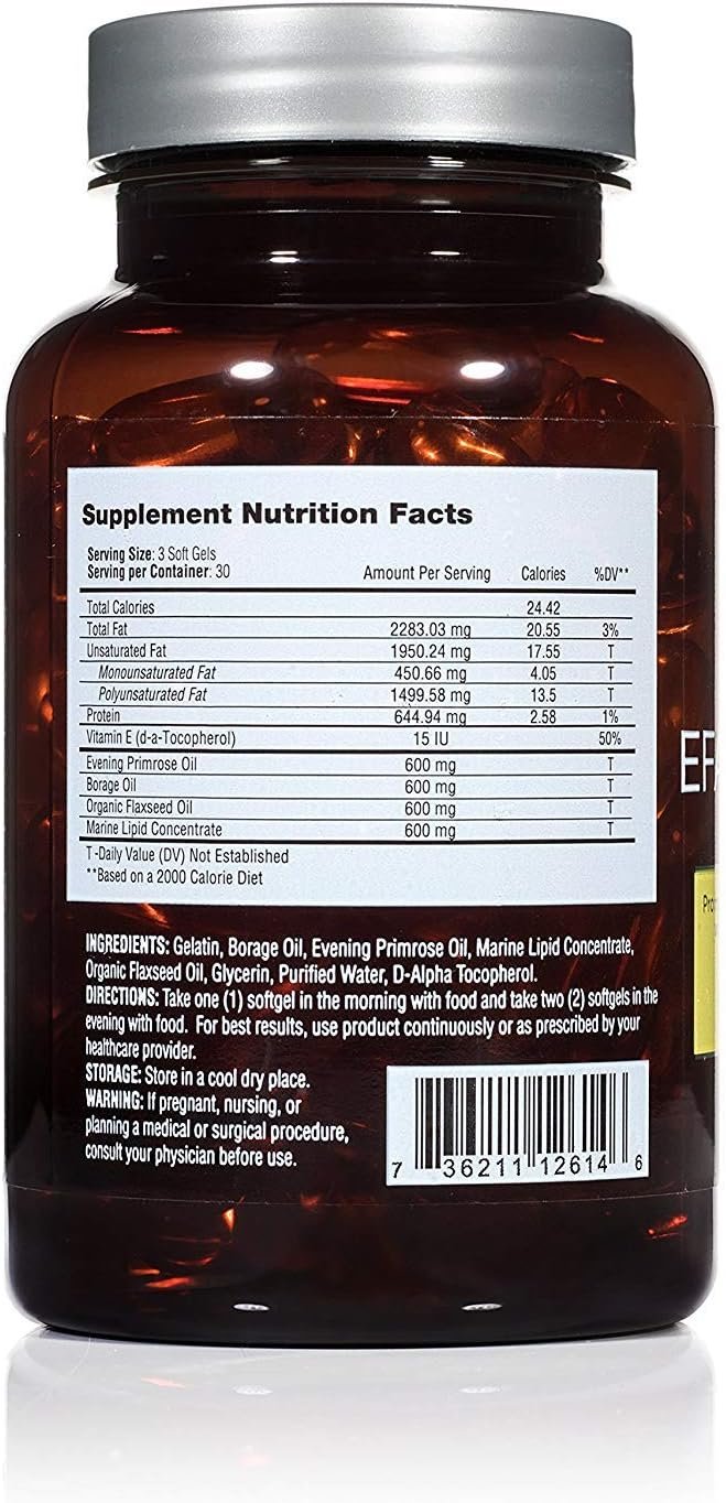CONTAINS: Evening Primrose Oil 600 mg, Borage Oil 600 mg, Organic Flaxseed Oil 600 mg, Marine Lipid Concentrate 600 mg per serving