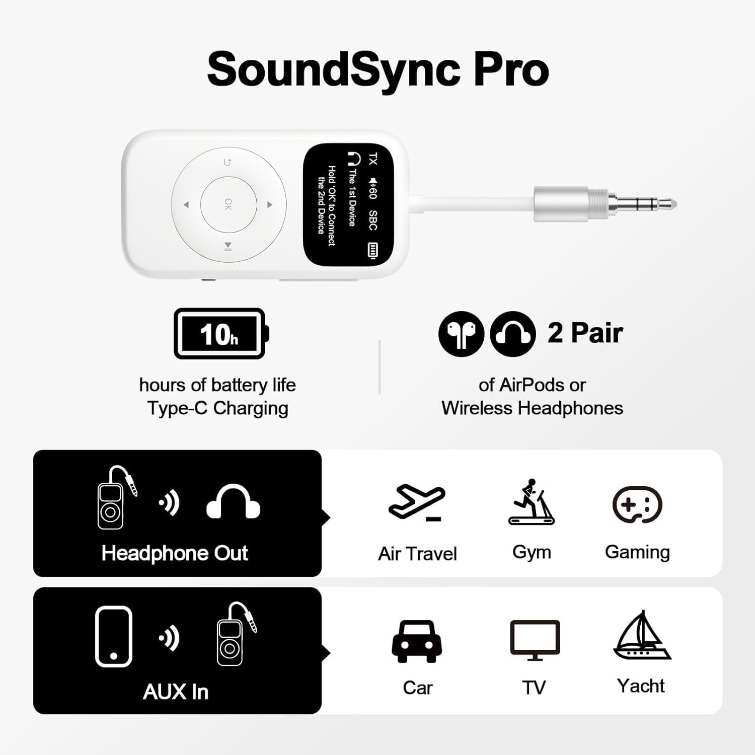 *Compatible devices? Supports to wire to most 3.5mm audio output jacks and pair with most Bluetooth devices. *Airpods? Supports most Airpods except Airpods Gen 2 beacause of its different Bleutooth codec. *Musical instrument? For live musical equipment, it is suggested using the specialized Bluetooth transmitter receiver. *Sound still from TV? 1. Ensure the aux cale tightly plugged. 2. TV’s audio setting from “TV speaker” to “audio out”. *latency? The unique aptX Low Latency works if your paired Bluetooth devices support it too, or else it will adjust itself to the Bluetooth codec that the paired Bluetooth devices support. *Phone calls? Without a built-in mic, the adapter does not support any calls, or can only play or listen to sound. *Does not pair? Please clear the Bluetooth history of your Bluetooth devices before paring.