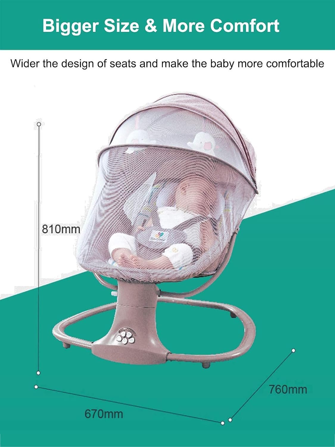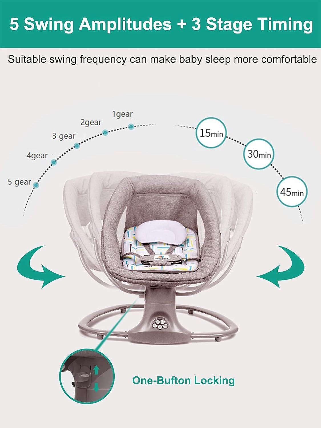 【Five-gear Swing & Three Timing Modes】 Five swing gears, simulating mother’s hands; Suitable for baby’s swing amplitude and frequency, allowing baby to sleep more peacefully and comfortably; 15-30-45 minutes three timing modes, which can be adjusted at will. Mother is more worry-free after setting the stop time.
