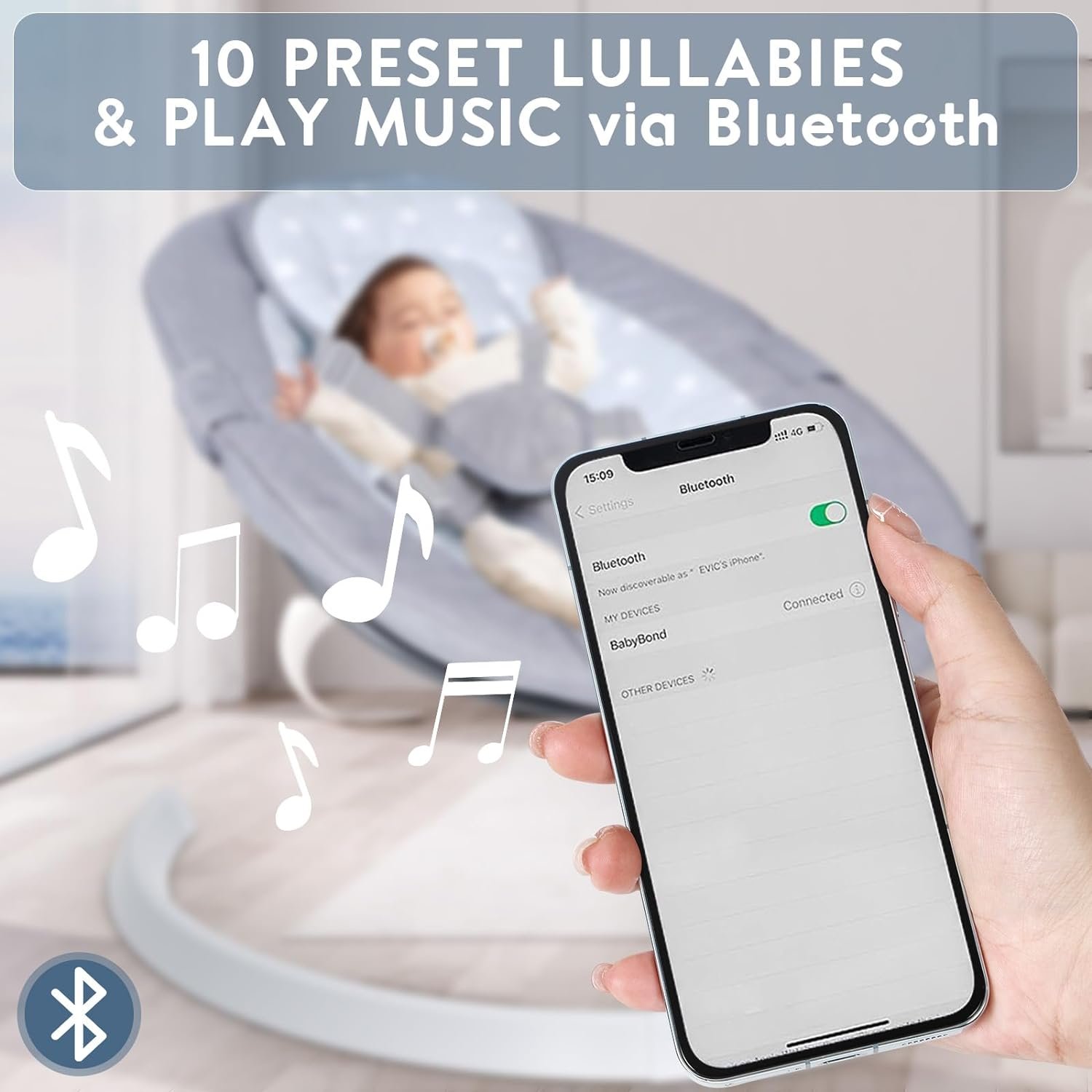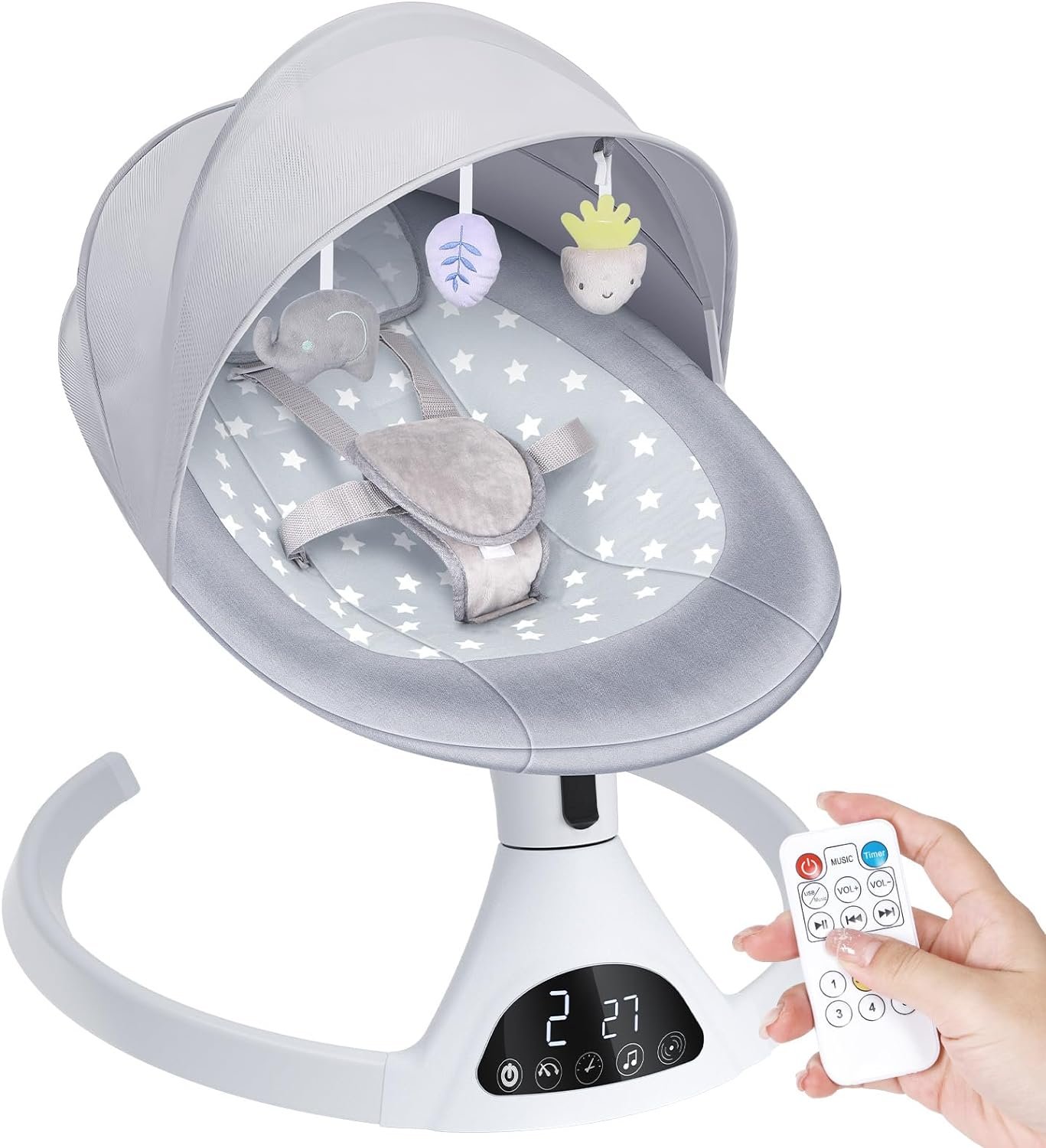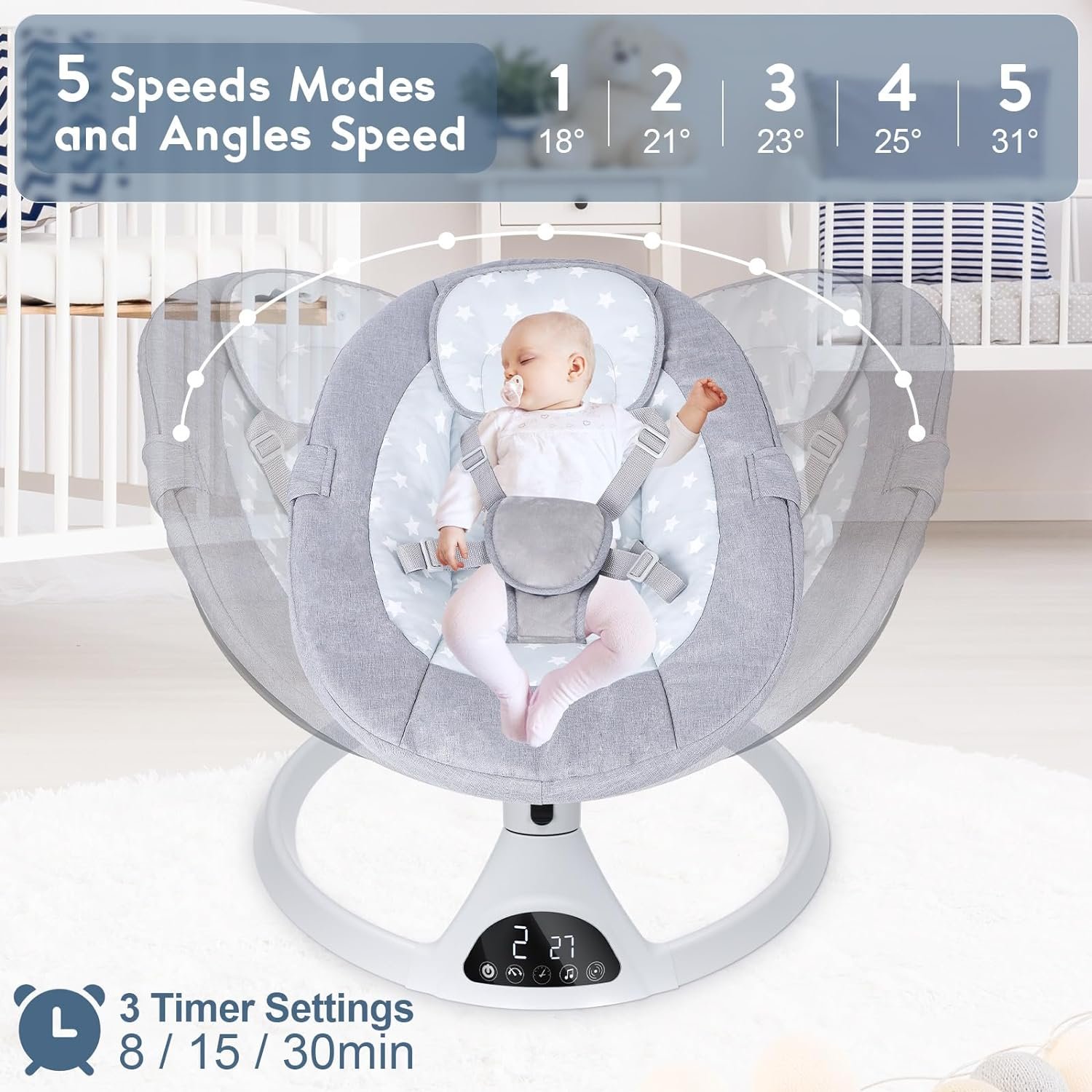 【Multi-Functionality】 This baby swing offers a range of features to cater to your baby’s needs. It comes with 5 adjustable swing speeds, allowing you to customize the swinging motion to mimic different speeds of a mother’s embrace. It also has three timer settings (8, 15, and 30 minutes) for added convenience. Additionally, it comes preloaded with 10 lullabies and can be connected to Bluetooth to play your baby’s favorite songs. The swing can be controlled through both touch panel and remote con