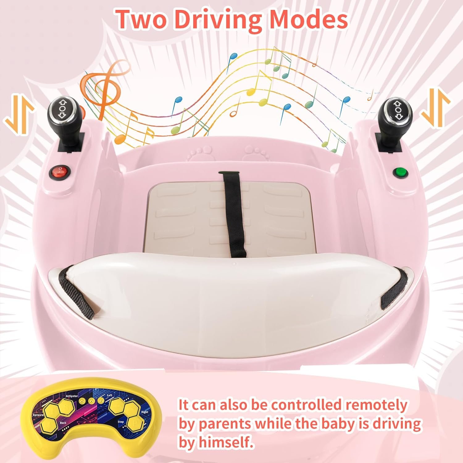 💞【Two Driving Modes】Baby can drive this kids car independently through the two joysticks and switch buttons, and parents can also use the remote control mode to control the direction and adjust the speed for younger children.