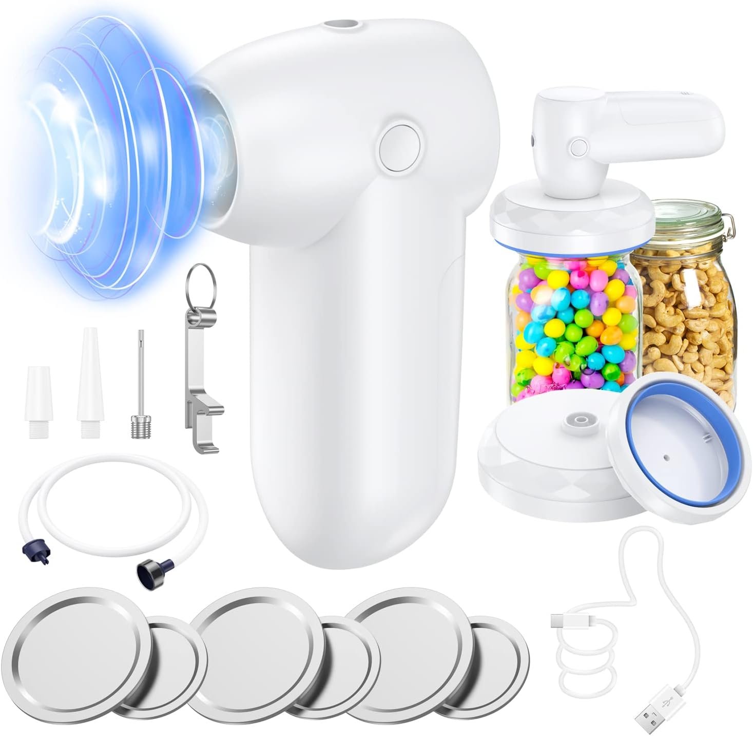 Full Starter Kit – You will get 1 x 6 in 1 Electric Mason Jar Vacuum Sealer, 1 x Wide Mouth Sealer, 1 x Regular Mouth Sealer, 3 x Wide Mouth Mason Jar Lids(86mm) and 3 x Regular Mouth Mason Jar Lids(70mm), 1 x Hose, 1 x Lid Opener (for easily open mason lid ), 1 x Type C Cable. If you have any question about our 6 in 1 Electric Mason Jar Vacuum Sealer, please contact us, we will provide you with a satisfactory solution.