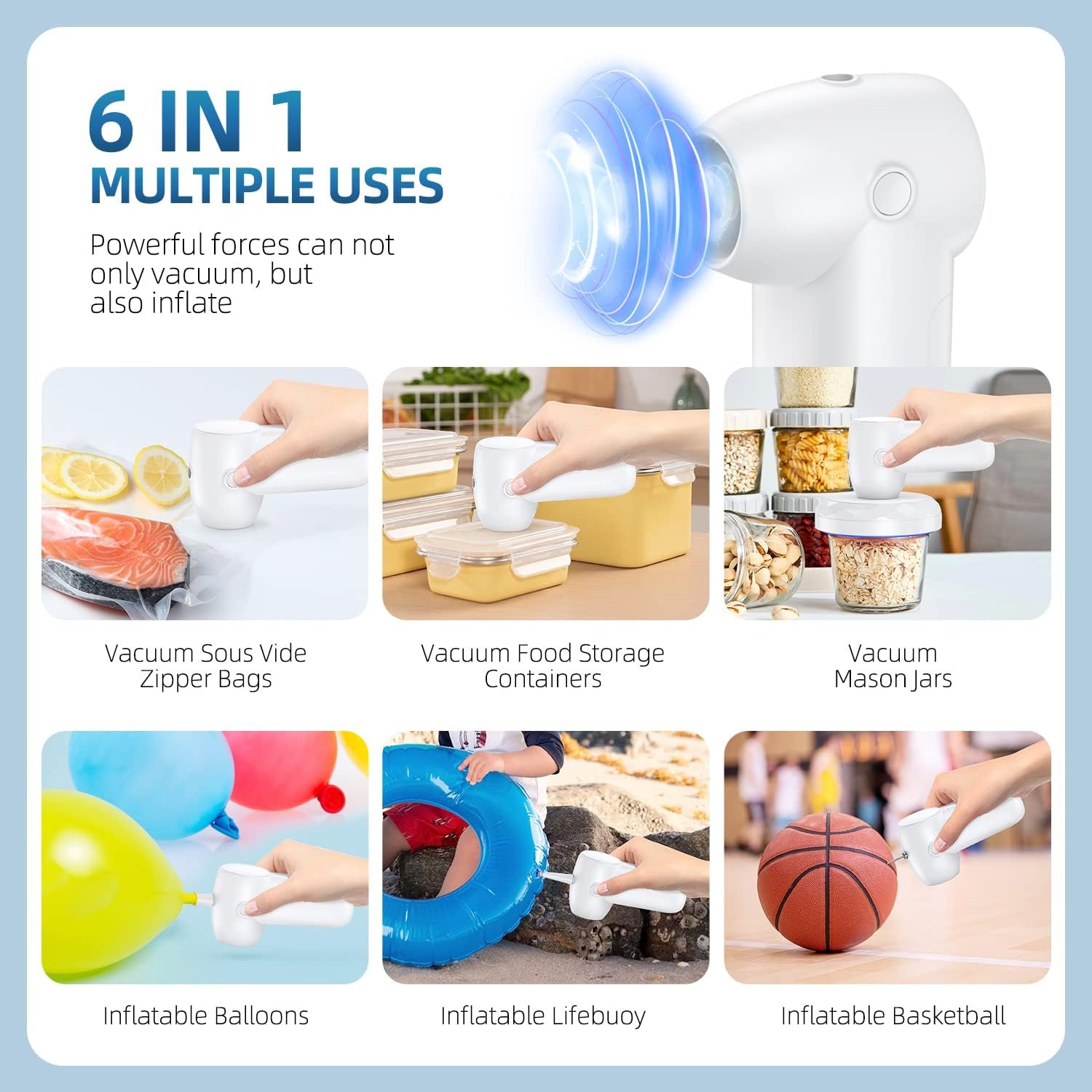 6 in 1 Electric Mason Jar Vacuum Sealer – Our 6 in 1 electric handheld vacuum sealer for dry and wet foods. One-button switch, easy to use, only 10 seconds to vacuum. Our electric mason jar vacuum sealer can vacuum zipper bags、food storage containers and mason jars. It comes with lifebuoy air nozzle, balloon nozzle, air pump needle on the back. It can inflate balloons, life buoys, basketball, football, etc. Meet all your needs.