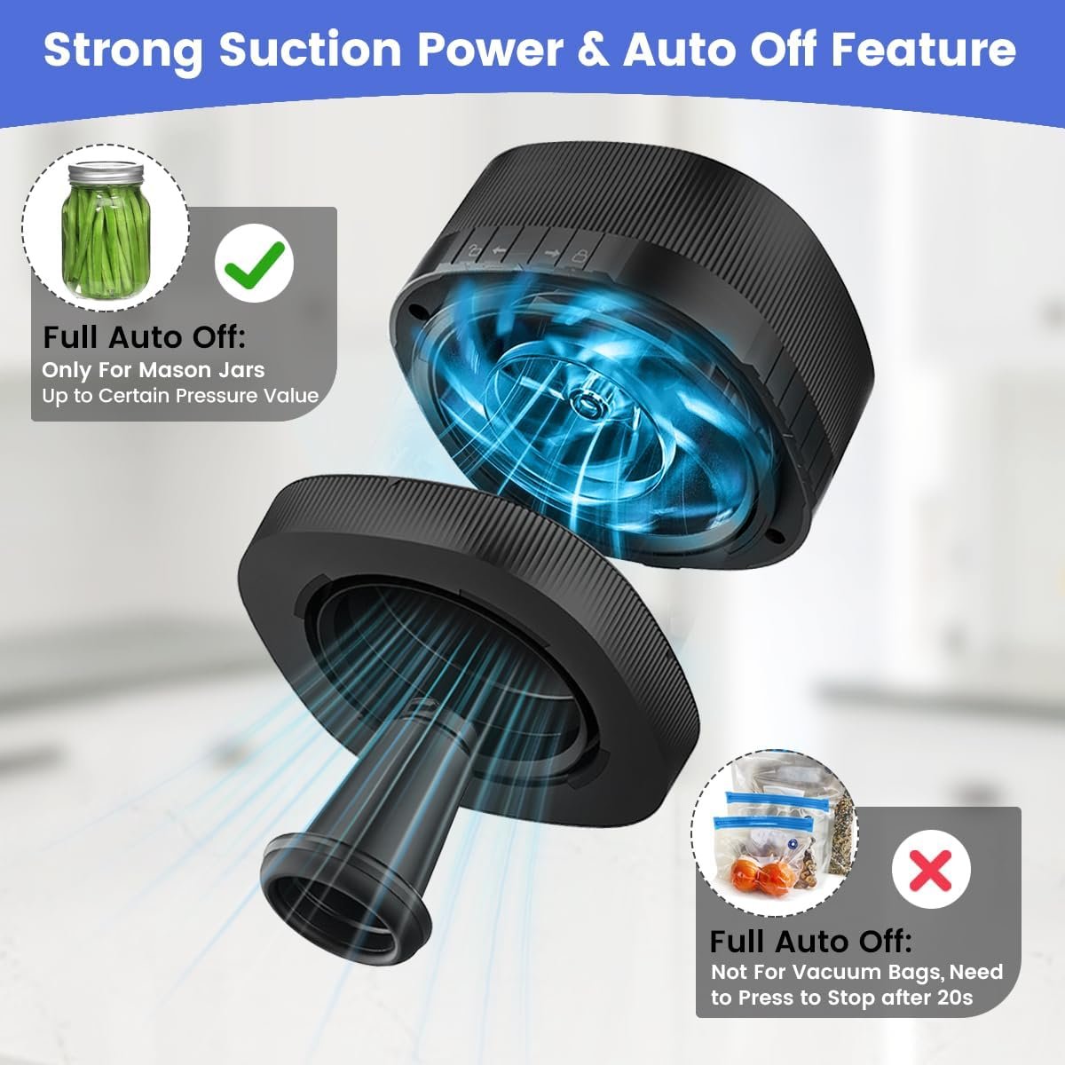 【Compatible with Vacuum Bags】The upgraded mason jar sealer vacuum kit is designed to seal vacuum bags effectively, allowing you to easily seal a variety of food vacuum bags sizes. You’ll get more features and better quality than other canning jar vacuum sealer for food storage on the market. (Tip: Need to press to stop after 20s when electric jar sealer vacuum sealing is complete.)
