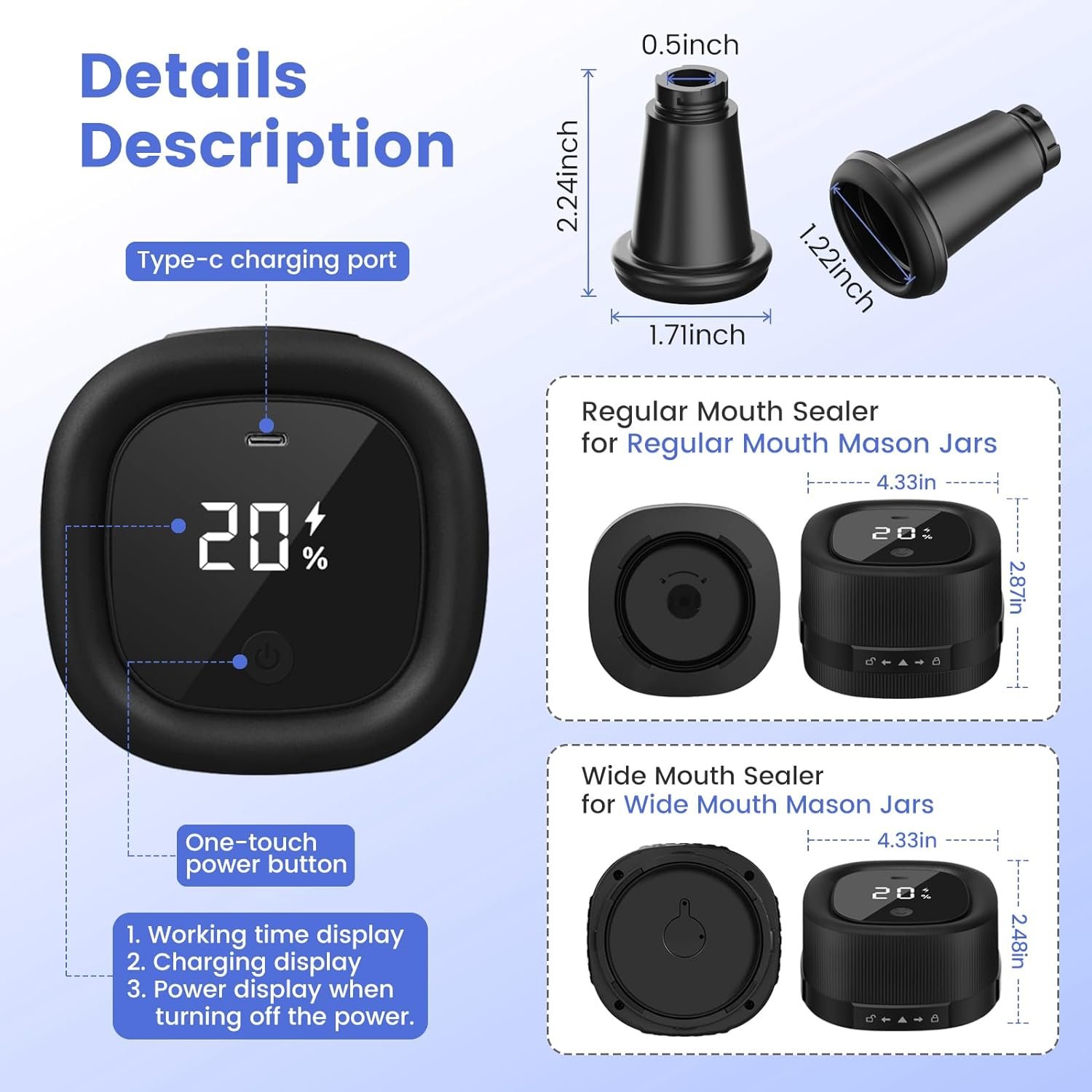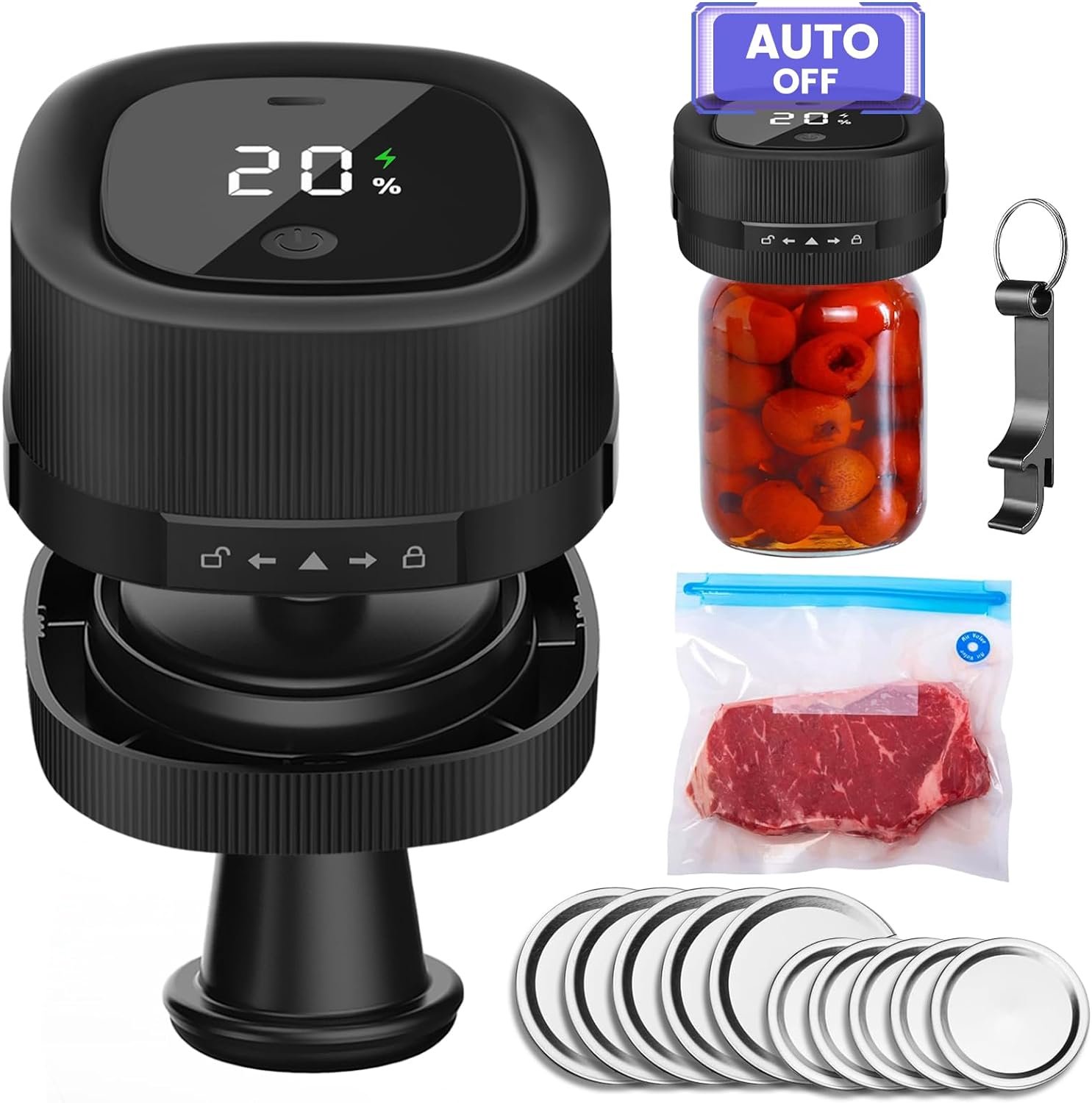 Mason jar sealer vacuum kit include: 1* vacuum canning jar sealer, 5* wide and 5* regular mouth mason jars lids, 1* suction nozzle for bags sealer, 1* vacuum bag, 1* jar opener, 1* Type-C cable and user guide. Its built-in display screen ensures clear visibility of battery status and working time.