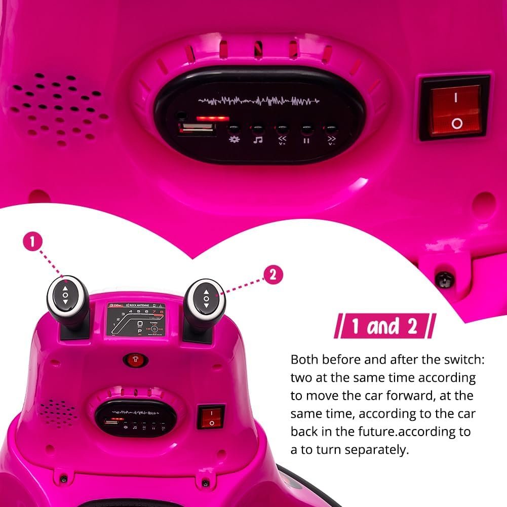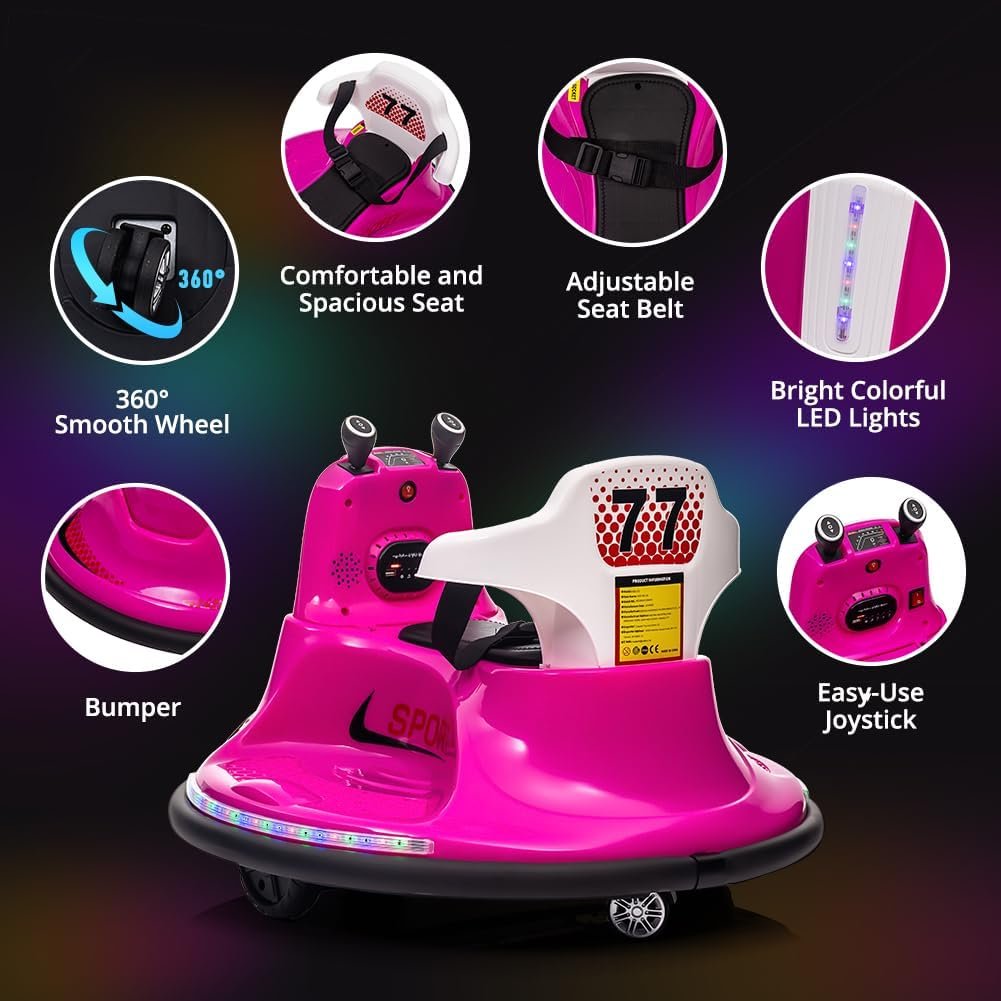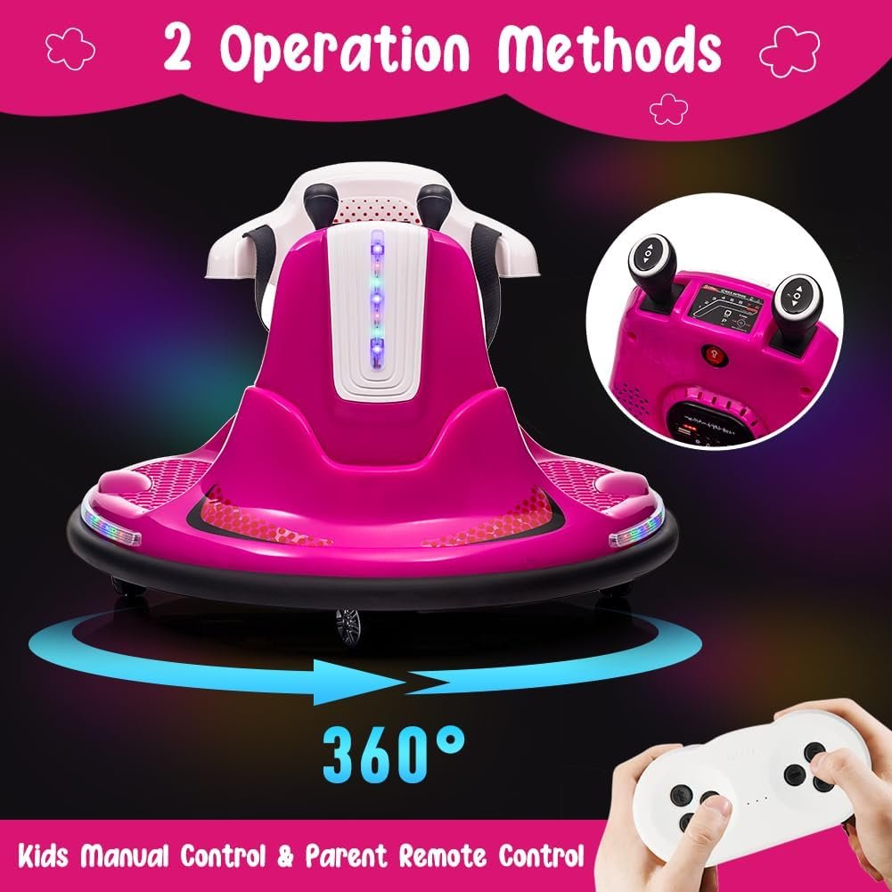 【360-Degree Spin Wheels】: This ride-on bumper car features 360-degree spin wheels, allowing for smooth movement and flexible turns on various road surfaces. With a slow start function, it runs at a speed of 1.5-3 mph, providing a comfortable and safe driving experience for children.