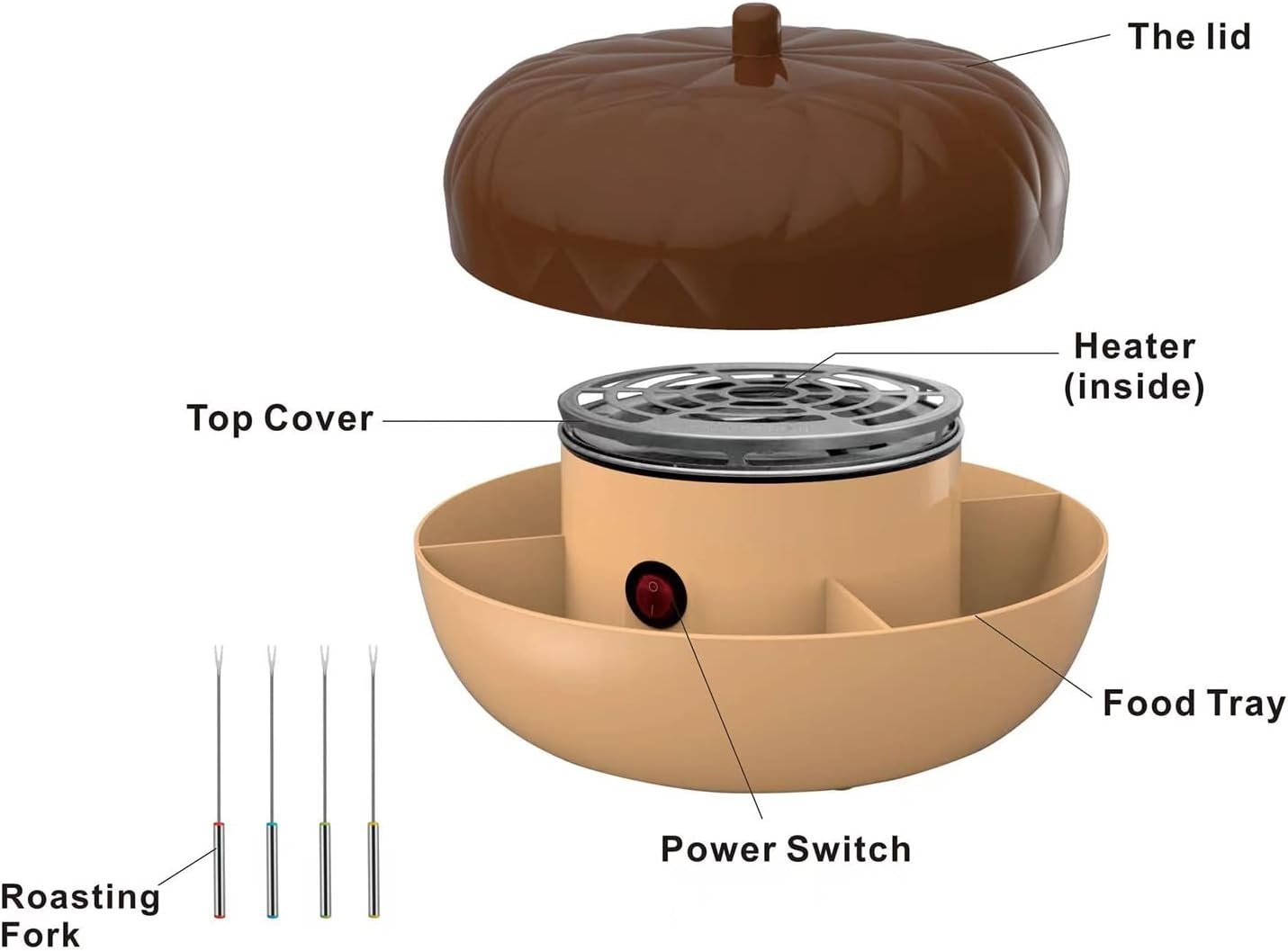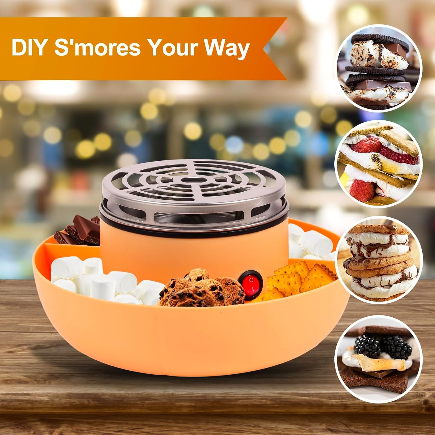 ELECTRIC FLAMELESS HEATER. Safer alternative to gas or wood fire pit, this electric smores maker is built with safety in mind. Requires nothing but an electrical outlet to start making DIY S’mores station & table-side dessert.