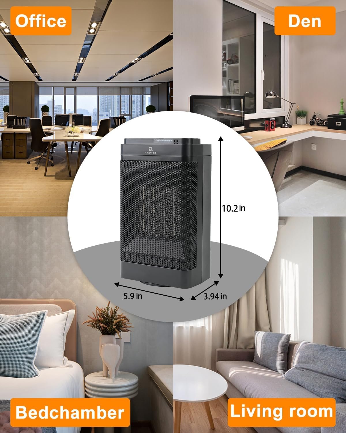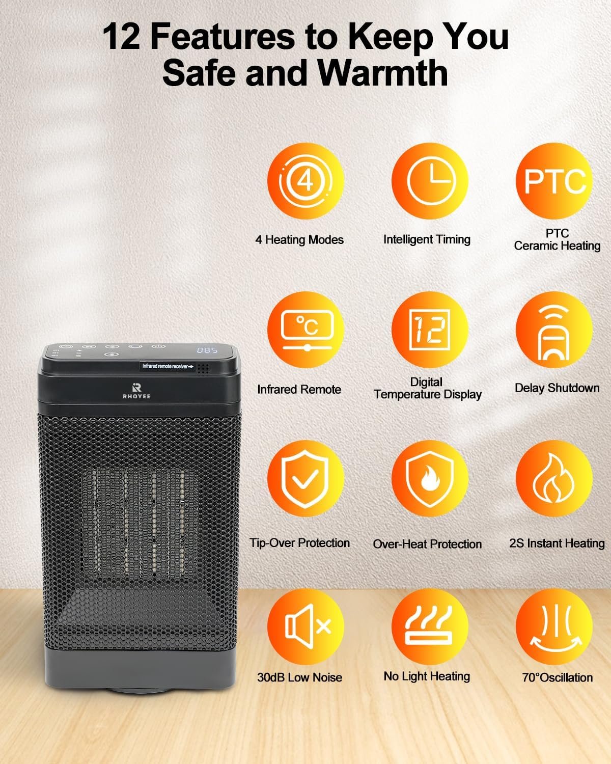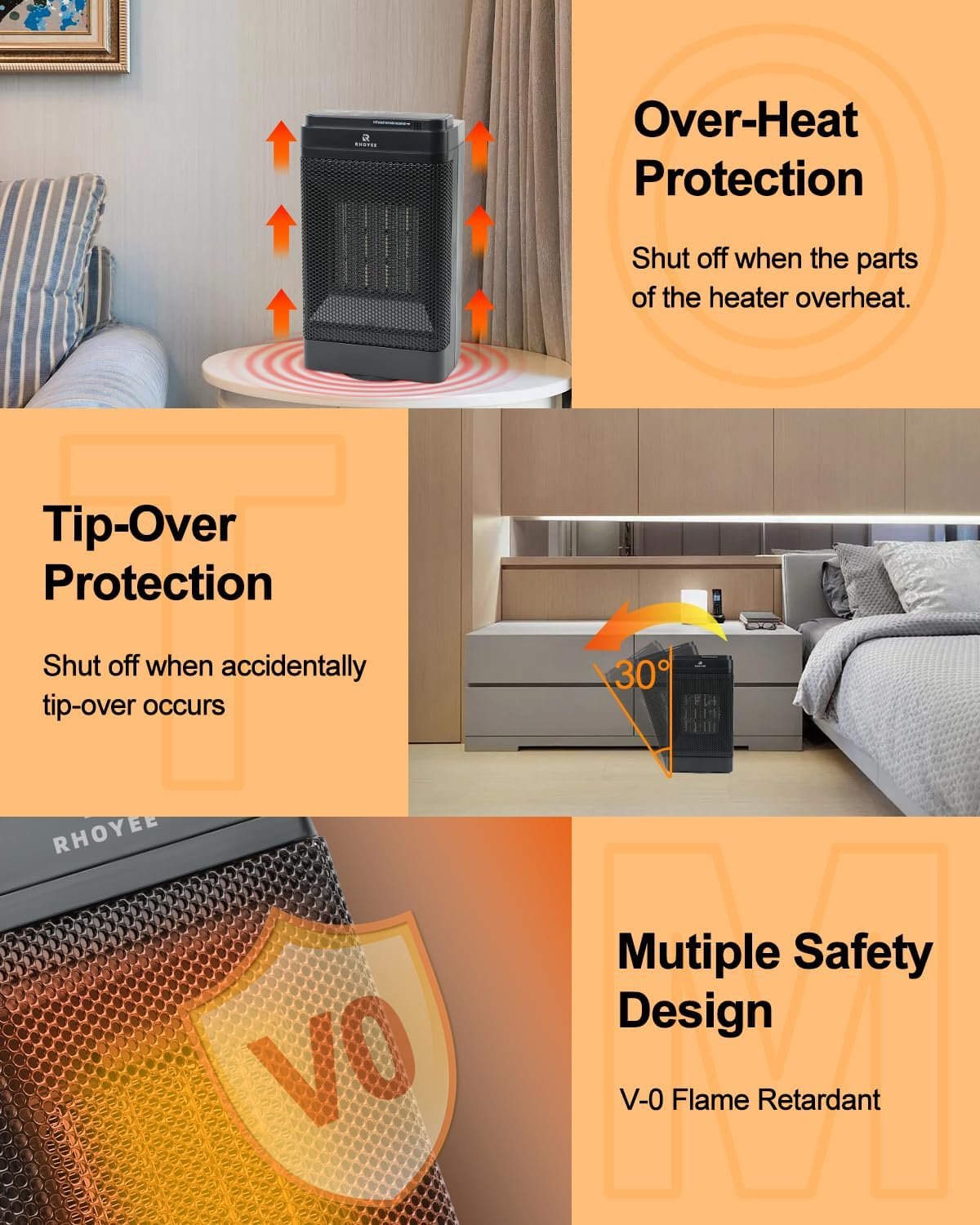 🔥 UNBREAKABLE SAFETY: Rhoyee heaters use V-0 flame retardant material to prevent fire hazards. They’re equipped with an automatic shutoff for overheating and tip-over protection. Plus, they run an extra 30 seconds after turning off to extend their lifespan. Your safety is our priority.