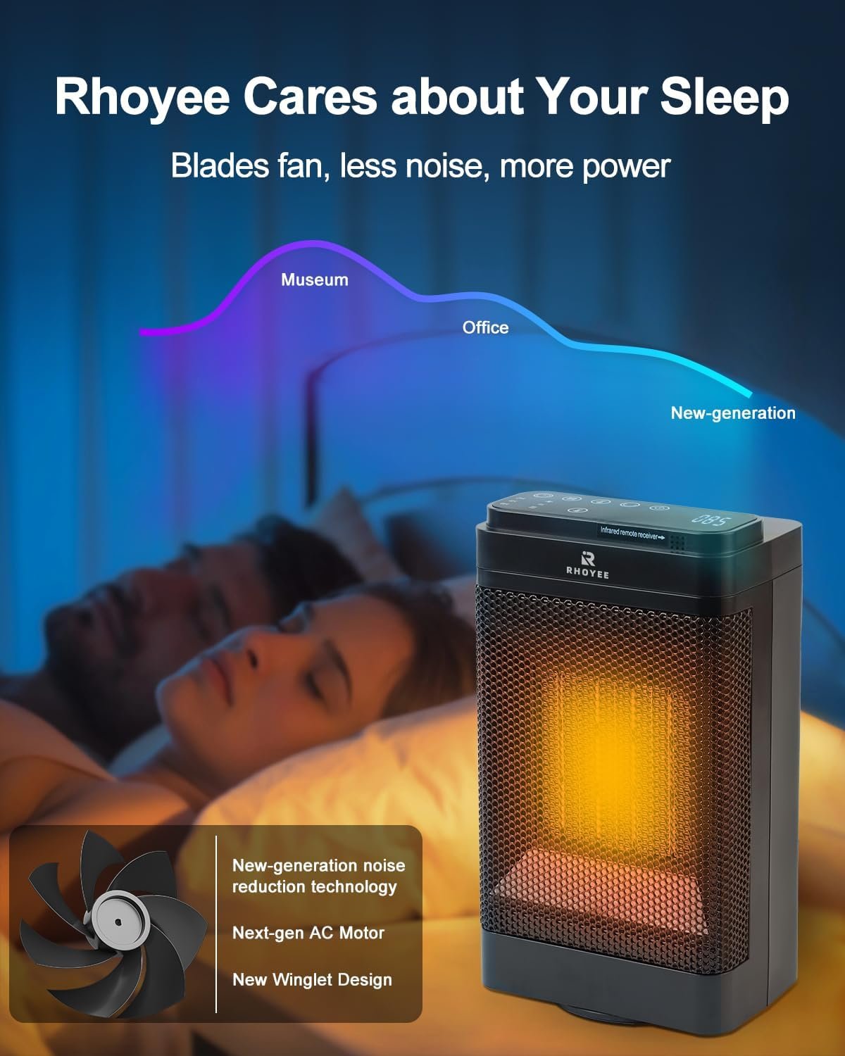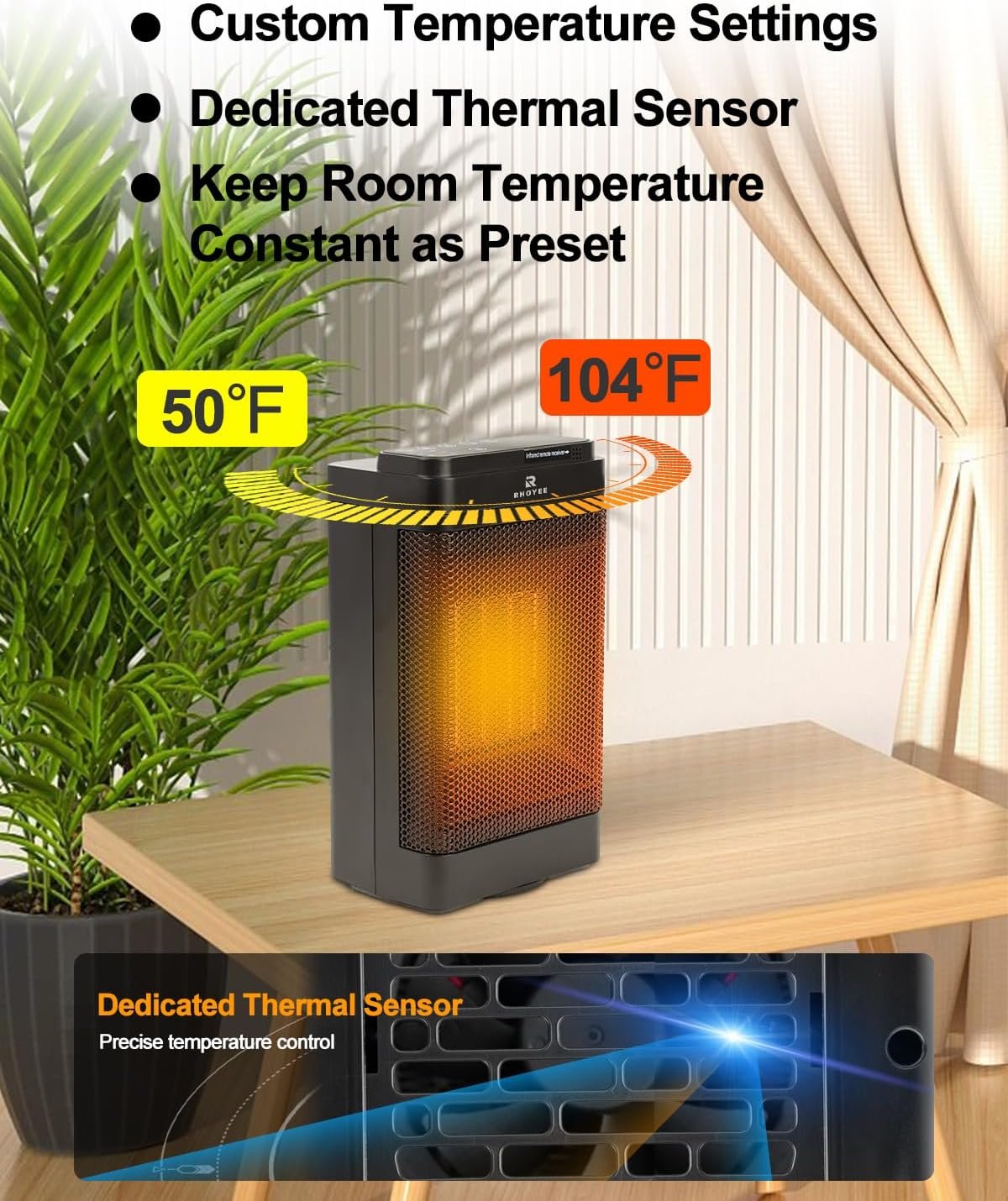 🔥 PRECISE THERMOSTAT CONTROL: Rhoyee Space Heater features an advanced temperature sensor that maintains your room at your desired comfort level. Enjoy customizable warmth with ECO mode and a digital thermostat adjustable from 50 to 105 ℉, in precise 1℉ increments. Achieve perfect warmth for ultimate comfort.