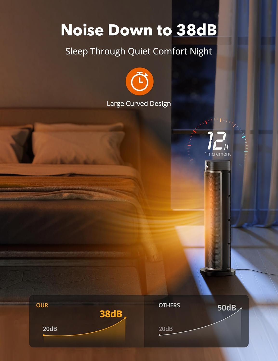 Cold won’t stand a chance with the 24-inch Oscillating Tower Space Heater. Loaded with great features including a 12-hour timer, tilt protection, and 3 heat settings, this ultra-quiet 38dB home heater warms every corner of a room with its wide 70° oscillating design.