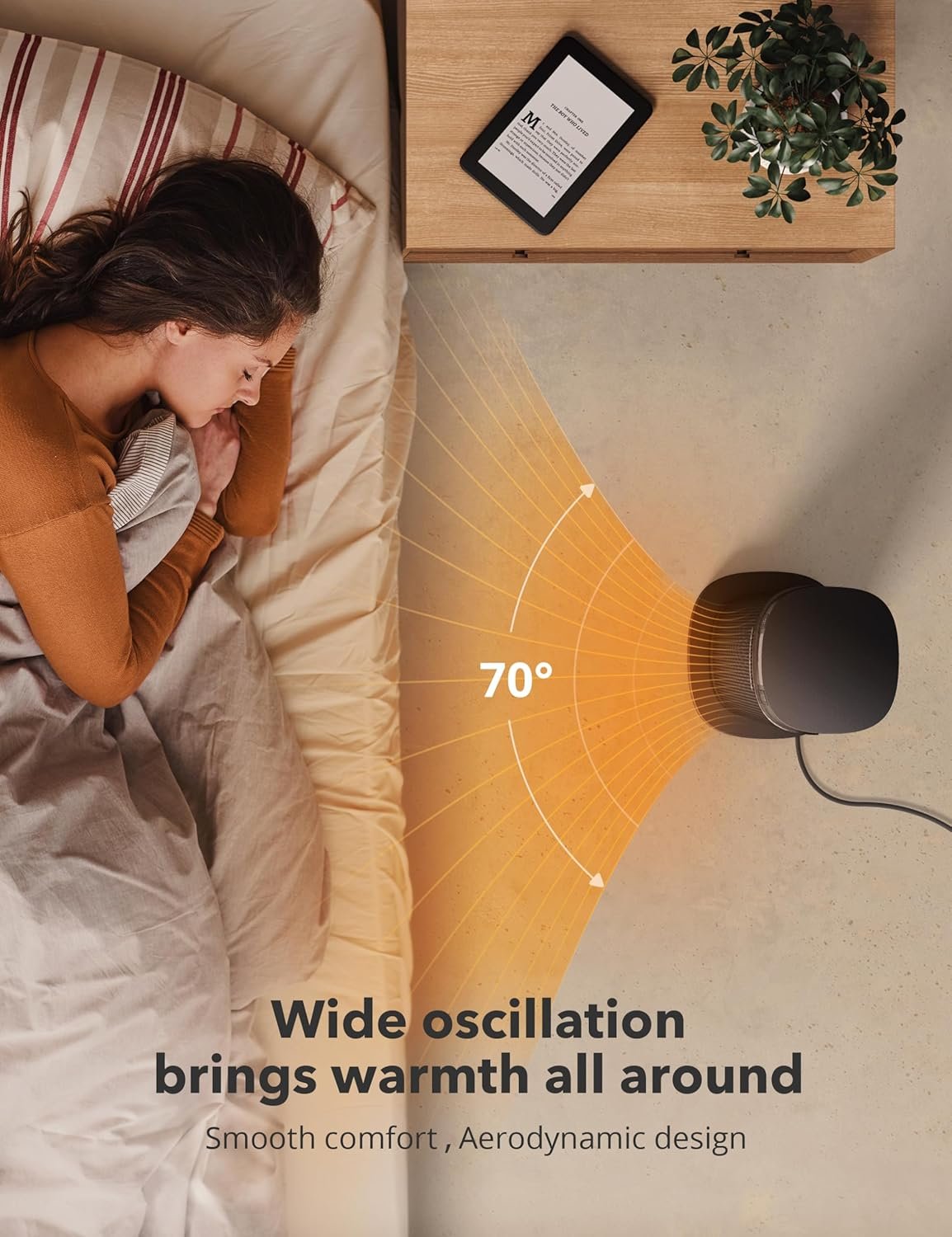 2s Fast Heating Tech: The indoor space heater utilizes PTC ceramic heating technology, providing rapid and efficient heating in seconds. The heater boasts 70°oscillation, ensuring even heat distribution in your room.