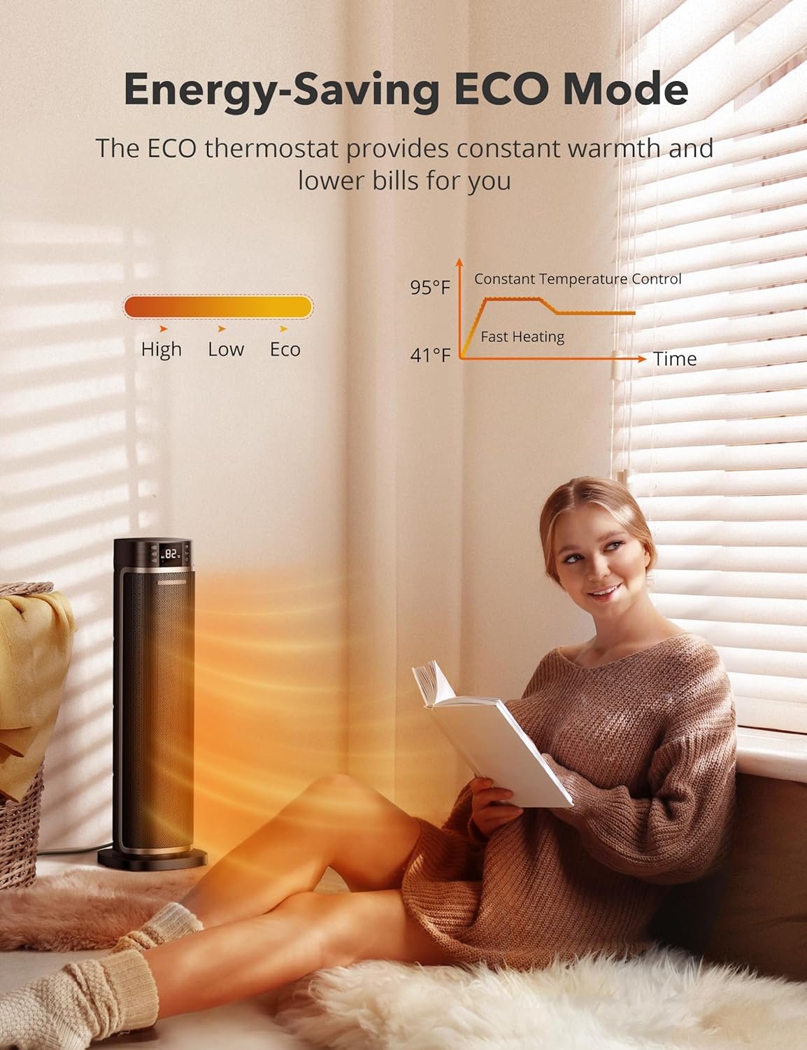 Save More with ECO Mode: The electric heater features an ECO mode that supports thermostat control. It automatically turns off when it reaches the desired temperature and turns back on when the temperature drops below the thermostat setting. The temperature range of the space heater is 41-95°F, catering to your various temperature needs.