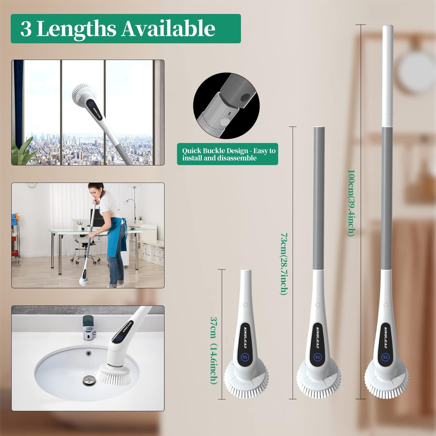 🌟【𝗗𝗲𝘁𝗮𝗰𝗵𝗮𝗯𝗹𝗲 & 𝗤𝘂𝗶𝗰𝗸 𝗕𝘂𝗰𝗸𝗹𝗲 𝗗𝗲𝘀𝗶𝗴𝗻】: To meet different cleaning needs and save your back and knees,our electric scrubber comes with 3 length extension rods, (14, 28 and 39 inches), just press the button and easily install and disassemble by the quick buckle, So you can clean from all angles and even in the corners! Works perfectly for soap scum on the wall, or hard water stains on the shower door.