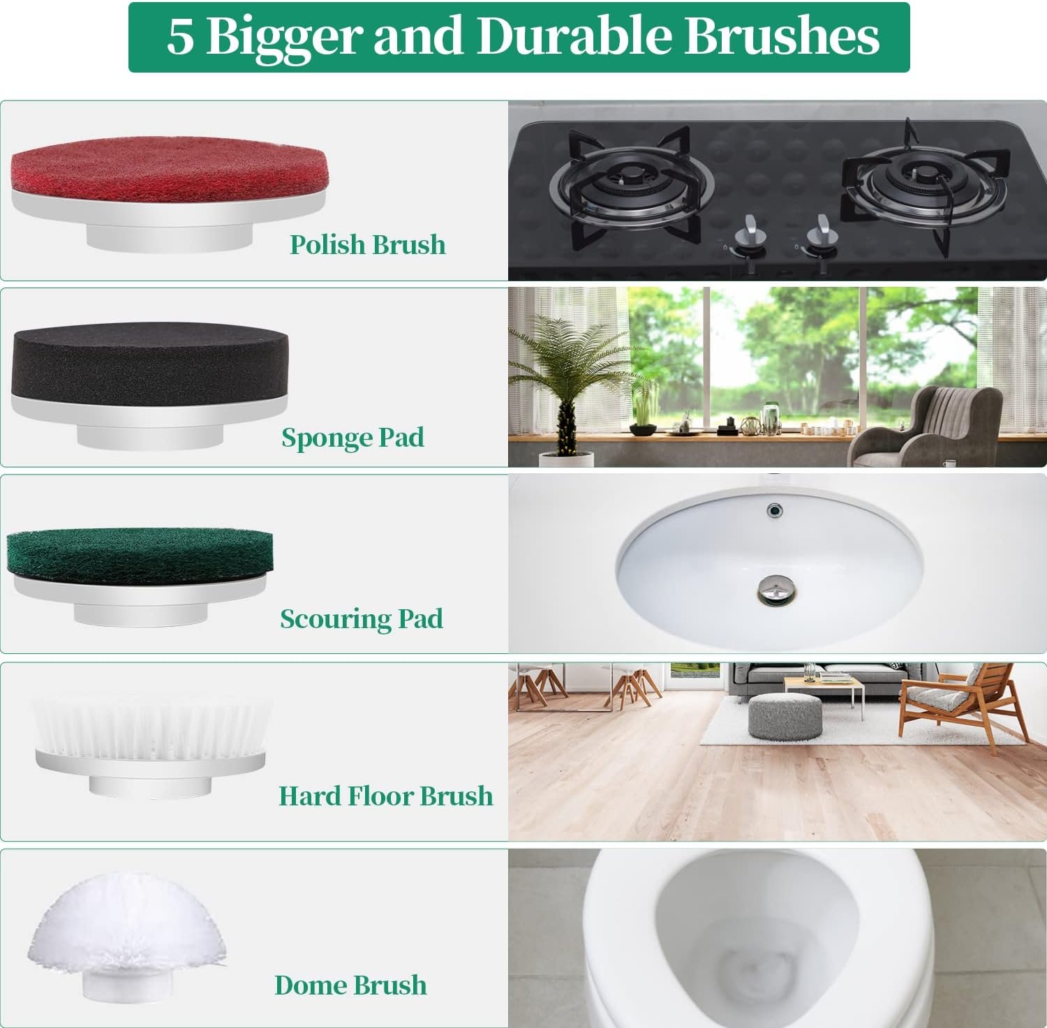 ✨【𝟱 𝗠𝘂𝗹𝘁𝗶-𝗳𝘂𝗻𝗰𝘁𝗶𝗼𝗻𝗮𝗹 𝗕𝗿𝘂𝘀𝗵 𝗛𝗲𝗮𝗱𝘀】: Our cordless power scrubber offers 5 versatile replaceable brush heads, suitable for various usage scenarios. For example, cleaning concave areas like bathtubs and sinks, cleaning narrow and hard-to-reach areas like corners and gaps as well as cleaning grounds, glass, tile wall, car surface, wheel hub, car seat, furniture and stove. Each brush and pad can help remove grout and stains effectively.