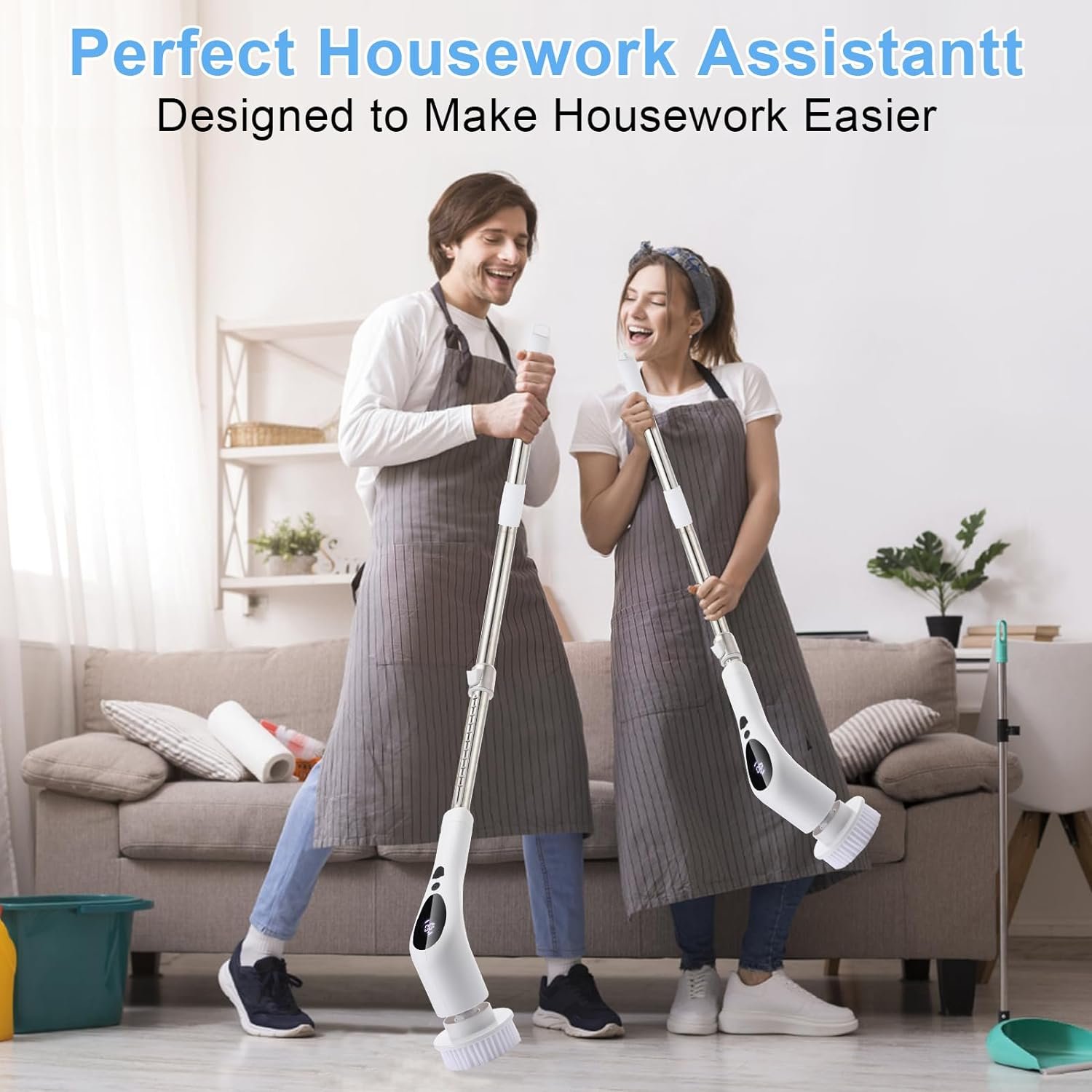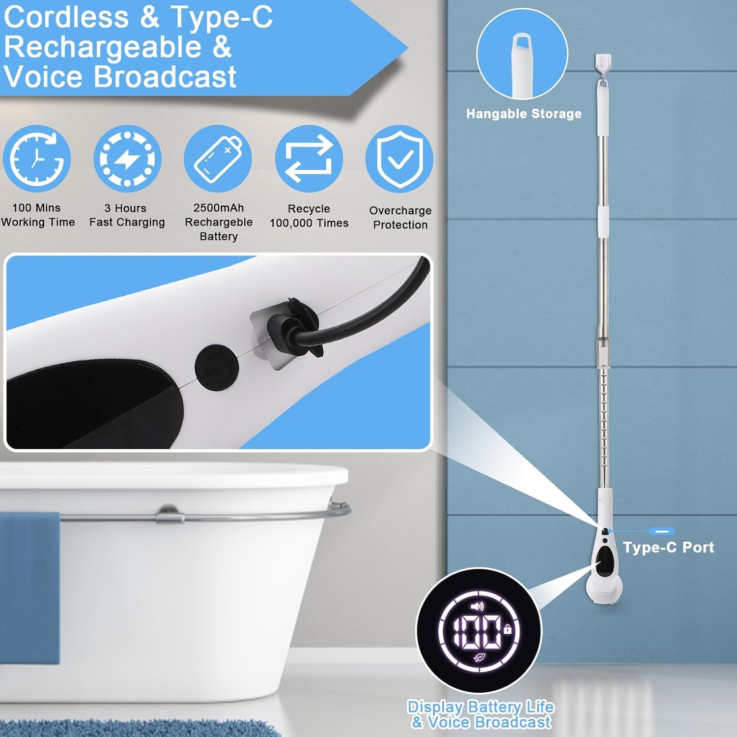 【2024 Upgraded 9 in 1 Electric Spin Scrubber】3 Adjustable Speeds (380/320/260RPM); 52″( 130cm) Ergonomic Extendable and Detachable Handle; Digital Display Screen; Voice Broadcast; 9 Replaceable Brush Heads; IPX6 Waterproof; Type-C Charging Port; 100 Mins Working Time. Say goodbye to the traditional cleaning and enjoy the convenience of science and technology to life, you will ahve a brand new living environment.