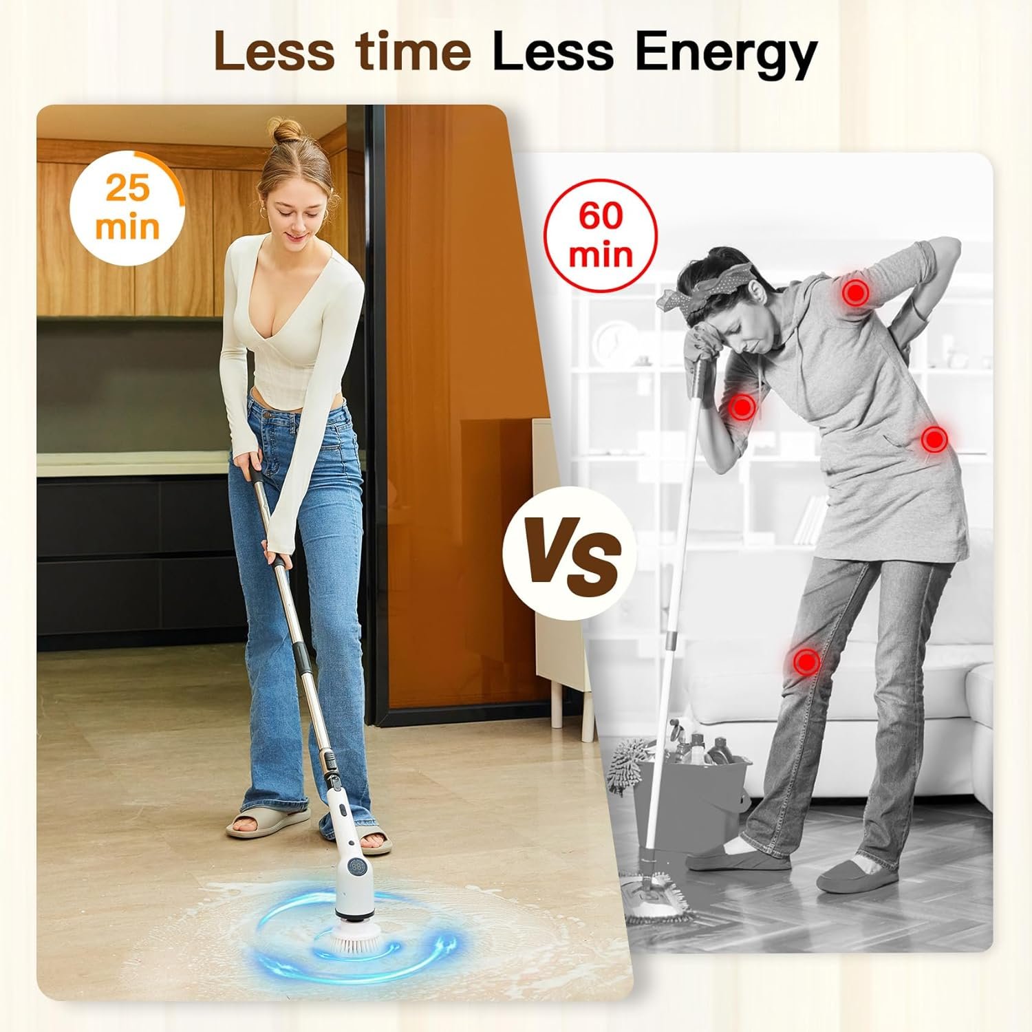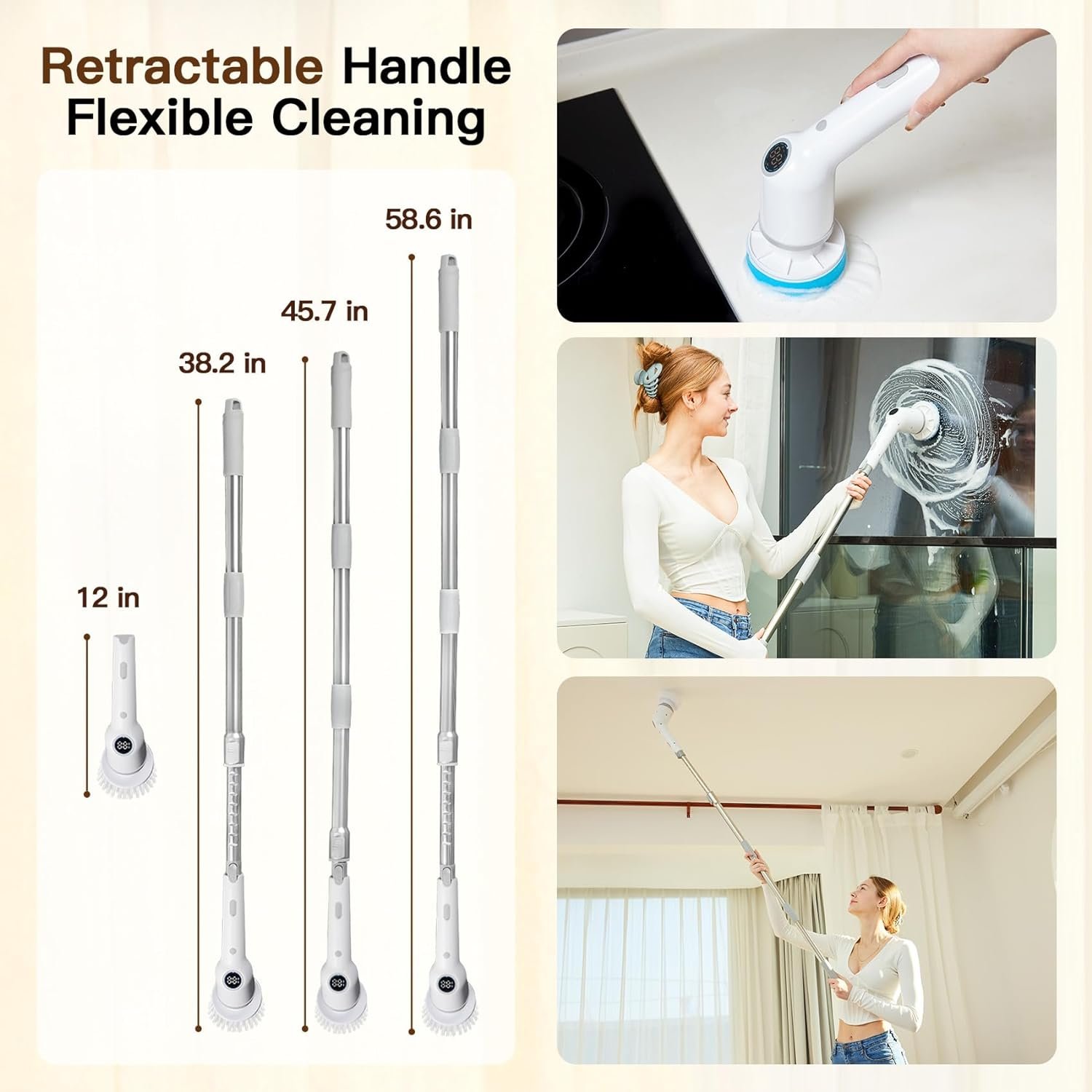【Adjustable Length & All-Round Cleaning】 The bathroom floor scrubber can be extended to 4 lengths, the length can be adjusted between 12 to 58.6 inch with just one rotation. You can easily clean hard-to-reach places at different height without kneeling or bending down, avoiding arm pain, back pain and all kinds of uncomfort. The extension rod can be removed to transform into 12 inch handheld electric cleaning brush.