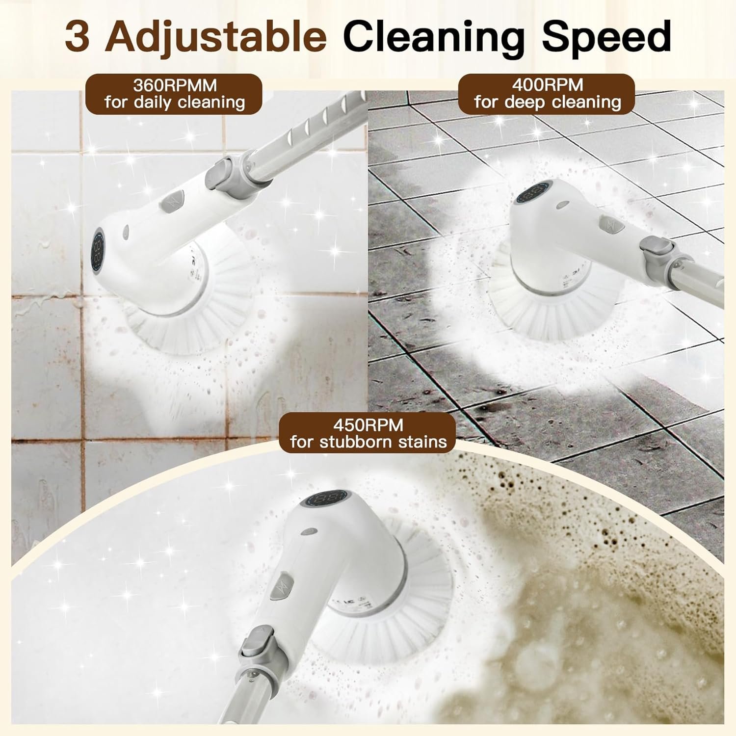 【3 Spin Speeds & Effortless Cleaning】 This upgraded cordless cleaning brush has 3 adjustable speeds: 360RPM, 400RPM, 450RPM. It can easily remove stubborn stains. Ideal product for cleaning kitchen, toilets, bathtubs, stone tile floors, recesses and hard-to-reach places. Its cordless design makes it useful anywhere, anytime at home. Give your home a brand new look!