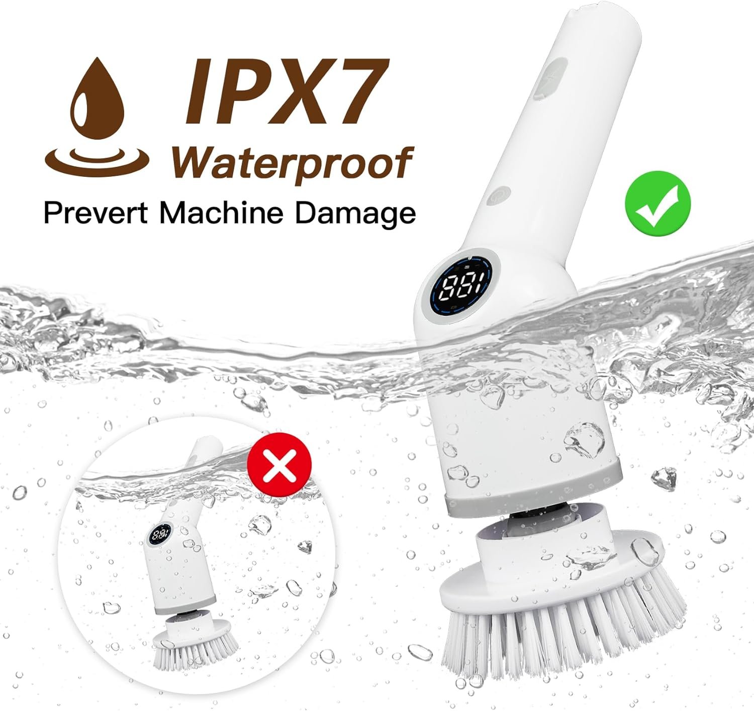 【Waterproof & Safe Cleaning】 The water resistance rating of our bathroom floor scrubber is IPX7 and it is high sealing designed, which prevents the water and humid environment on the machine. The body prevents water splashing, which extends the service life. Do not immerse the electric shower scrubber in water.