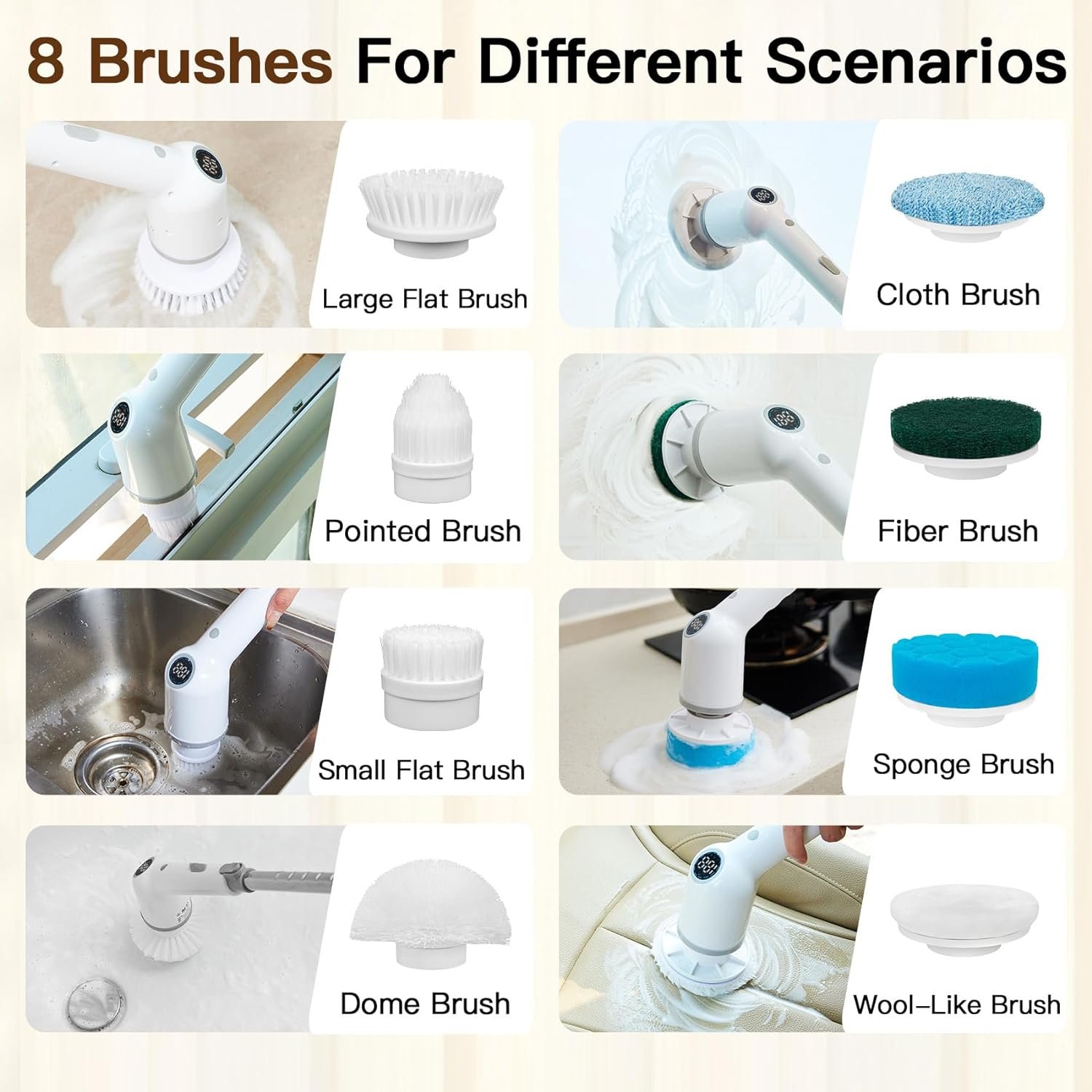 【8 Multifunctional Brush Heads & Hook, Storage Bag】 The electric rotary scrubber includes 8 replaceable brushes and a connecting seat. Suitable for various scenarios. For example: flat brush for tile floor, wall, pools and other surfaces; cloth brush for cleaning wooden floor and furnitures; sponge brush for cleaning windows, etc. Included hook and mesh bag provide convenient storage. When not in use, You can hang it with a hook.
