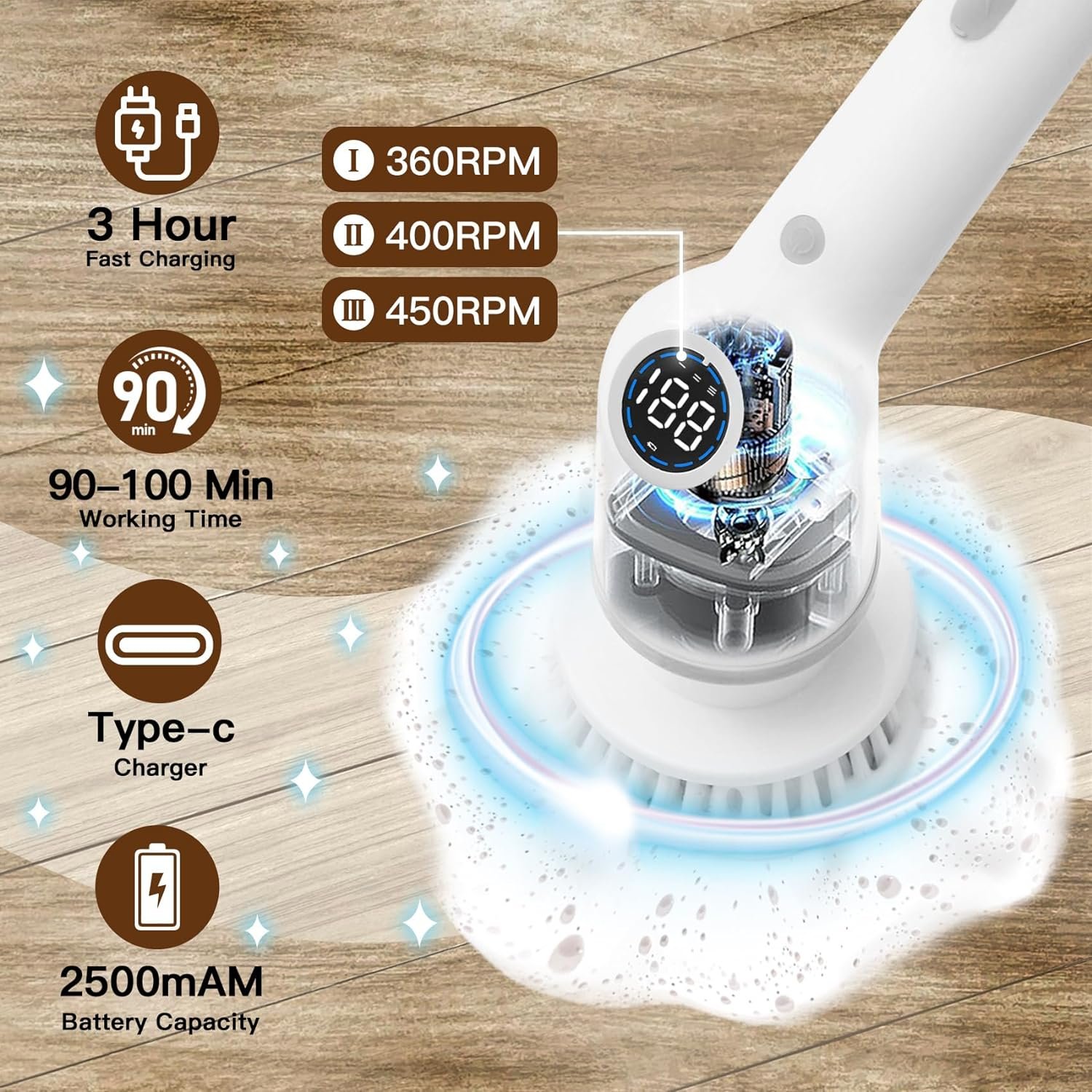 【Quick Charging & Battery Level Display】 The bathroom electric cleaning brush has a digital display, you can see the battery level here. Never need to worry about running out of power. It only takes 3 hours of charging to provide more than 90 minutes of continuous working time. USB-C charging cable included.