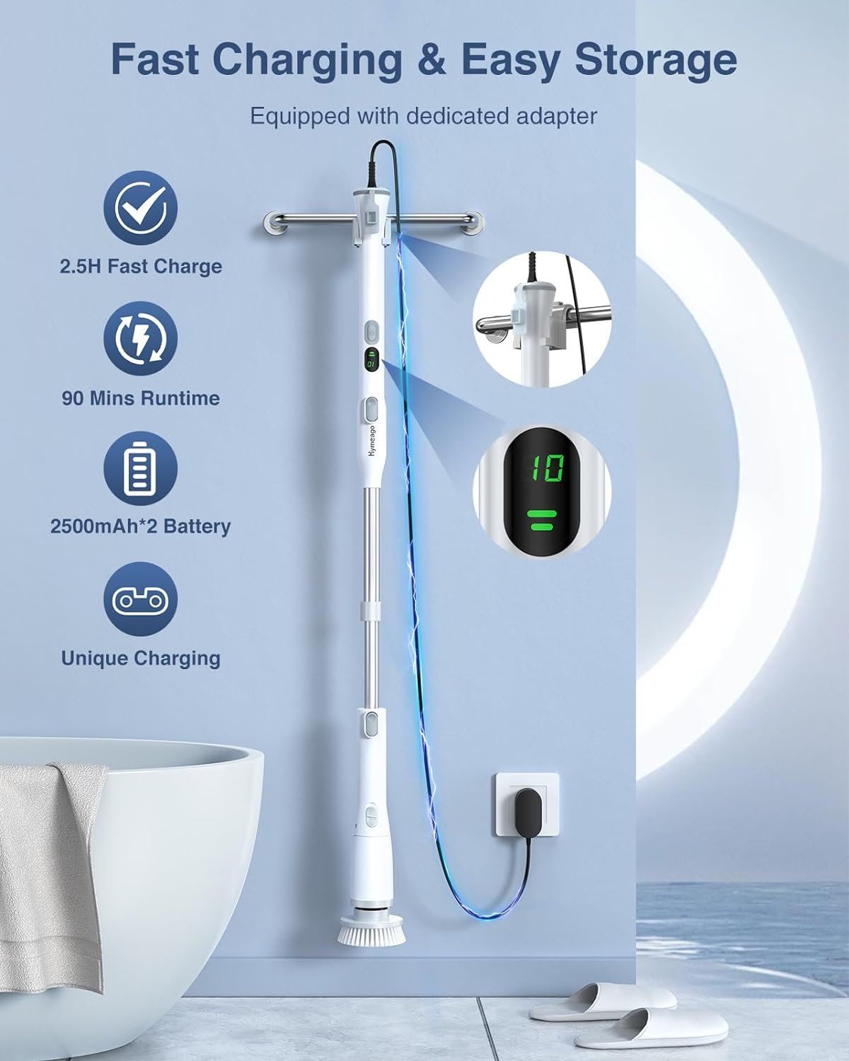 🔋[𝟐-𝐢𝐧-𝟏 𝐋𝐄𝐃 𝐃𝐢𝐬𝐩𝐥𝐚𝐲 & 𝐅𝐚𝐬𝐭 𝐂𝐡𝐚𝐫𝐠𝐢𝐧𝐠] The cordless cleaning brush has a LED display that shows the remaining battery and the selected spin speed, easily to know when the charging is needed. Also, our electric bathroom scrubber adopts fast-charge tech that can be fully charged in 2.5 to 3 hours. With the 2*2500mAh high-capacity battery, the scrubber can work last up to 90min, totally enough to clean the whole house. The equipped adapter, 5.9ft long cable and hook make it easy to store and charge.